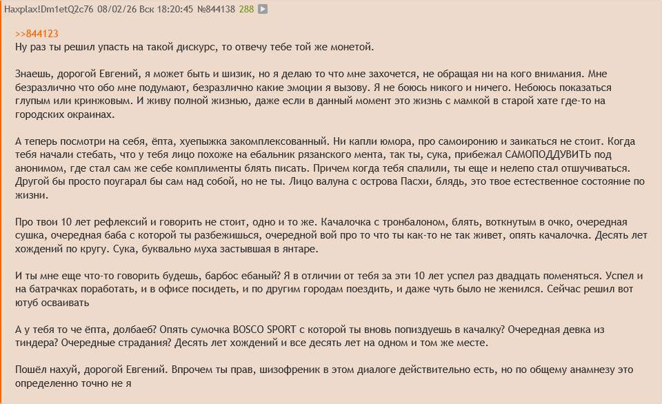 >Был бы пейсак реально умнее того же саса, который с ним два сапога пара, просто бы проигнорировал и сейчас глядишь был бы жив. Да где бля пара?! В чём хоть одна схожесть? Один - обычный немного туповатый нормис с радиорынка. Стас ай как просто скорее пара с бабусей из ларька - тож коммунист, тож орёт грубую бессвязную хуйню, тож трусливый как кураж. Две абсолютно разные личности.
