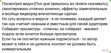 Друзья волевым решением я решил что все таки доделаю ролик про монтаж. Две недели работы выкидывать в помойку не оч хочется, хотя сомнения у меня очень сильные. Так что доделать то доделаю, но выкладывать или нет не знаю. Думаю будет собрана фокус группа перед публикацией, и по её оценкам уже будет принято решение отправлять ли видик окончательно в архив или нет