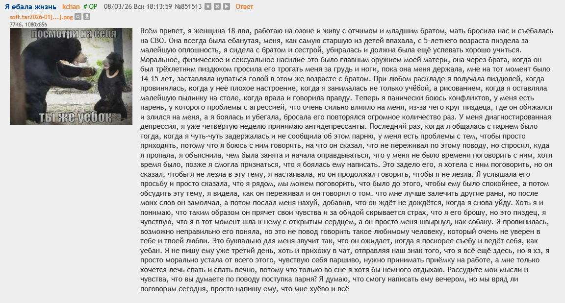 Я когда перестал к этому относится как к собственному траблу, так сразу же бля на нее наорал и гораздо быстрее ей объяснил, что ковыряние ножичком в руках не решает фундаментально ни одну проблему
