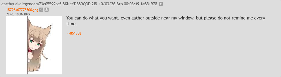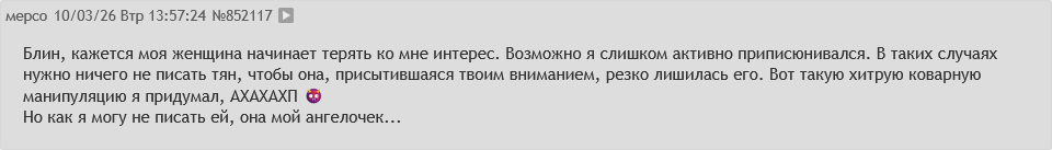 Факт в том, что потенциально интересный союз обречен. Наш скуфёночек, судя по всему, очень нежная натура. И привык быстро привязываться к людям. Отсюда это странное желания записать случайных людей с доски в свои "друзья". Отсюда же и расстройство, что паппи не посетила его тредик. А паппи наоборот, с избегающим типом привязанности. Ей нравится груминг нашего скуфика, но подпускать его к себе она не готова. В итоге страдают оба. Один от неразделенной любви, вторая от бесконечного воя и жалоб.