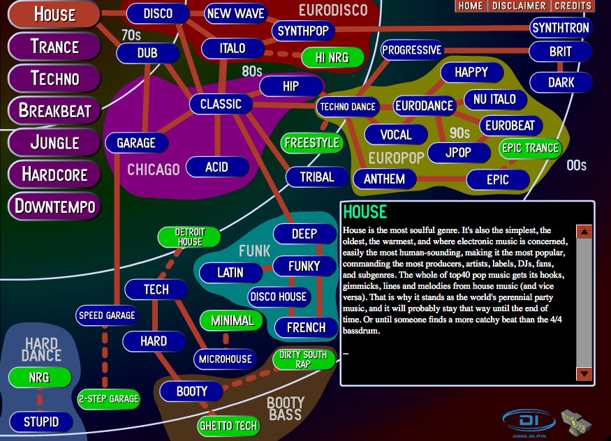 Анон, ты как эрудированное небыдло, скорее всего, знаешь про такую платиновую вещь, как Ishkur's guide to electronic music. А так же 12edit, Музпросвет и флешку, которая стрелочками показывается развитие и корни электронной музыки. Недавно металисты запилили подобную штуку с двумя стилями и тремя подстилями.
