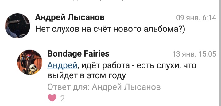 особо больше слухов нет. Инфа взята с какого-то сайта который в браузере по дефолту блокируется в целях безопасности, лол. В группе ВК админ тоже упомянул что возможно в этом году будет альбом. Но он особо не имеет отношения к самим феечкам, просто фанат https://sadwave.com/2019/05/bondage-fairies/