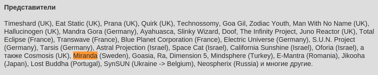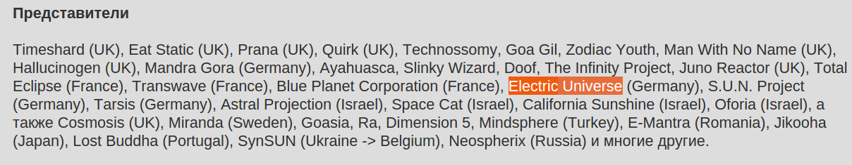 Analog Pussy (Israel), Shiva Space Technology (Israel), Infected Mushroom (Israel), Skazi (Israel), Yahel (Israel), Oforia (Israel), PsySex (Israel), PsyCraft (Israel), Intergalactic (Israel), Wizzy Noise (Greece), Dark Nebula (Australia), Jikooha (Japan), Laughing Buddha (UK), Talamasca (France), Bamboo Forest (France), Electric Universe (Germany), S.U.N. Project (Germany), Tarsis (Germany), 1200 Mics или 1200 Micrograms (Raja Ram), SynSUN (Ukraine -> Belgium), Kindzadza (Russia)...