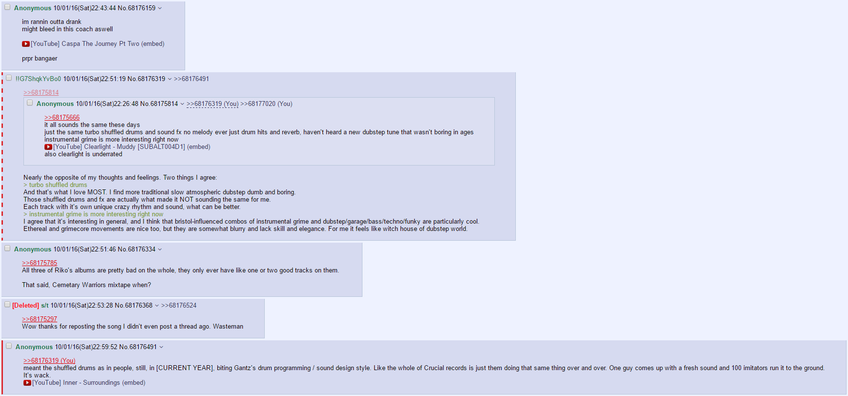 >>15193 Б-бит, наркоман ёбаный, во-первых, сравни трипы, во-вторых, не надо воспринимать всё так близко к сердцу. "Пусть будет" - это не обязательно "Я РАЗРЕШАЮ", а может быть ещё "я за". Просто блядь не сидеть же аккуратно подбирать слова по полчаса к каждому посту. > чятики Ну хуй знает, сколько не пытался, всегда как-то уныло. Пока решил перекатиться сюда, посмотреть, как оно: http://boards.4chan.org/mu/thread/68155711 https://www.4chan-x.net (чтоб soundcloud встраивалось, чтоб ютуб ссылки сразу подгружали название)