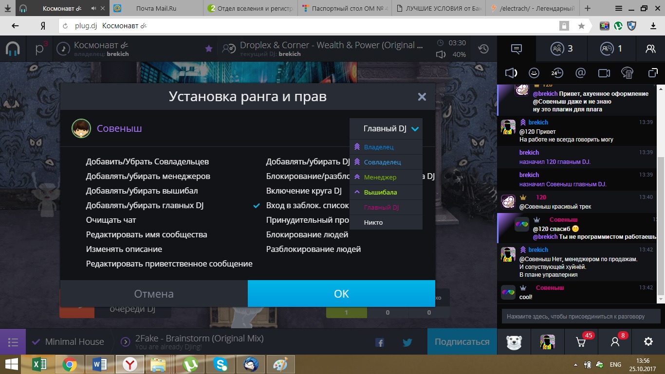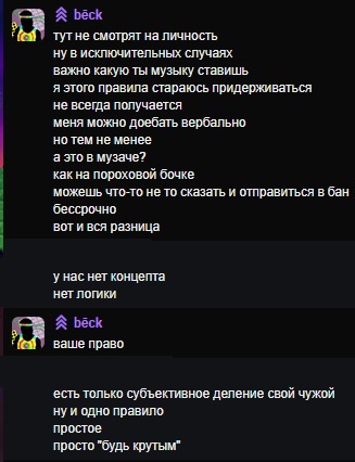 >>16799 >Оно несколько показательно в отношение к посетителям Если заменить слово на "долбоёбам" становиться всё на свои места. Электрач это не "демократия", это клуб, частная вечеринка, с определённым "музыкальным кодом" по аналогий с дресс кодом и нормой поведения. Если так хочется поставить музыку жанра который не соответствует коду нашей группы предлагаю съебать в другое место и ставить там свою музыку, ровно так же стоить съебать и тем, кто страдает девиантным и вызывающим поведением, вам не место среди нас. Голосовалочки пилят те кто о правилах нашего общества гласных и неочень знал и тем не менее их игнорировал, по этому голоса этих людей в расчёт не идут, а иначе сказать не решают нихуя.