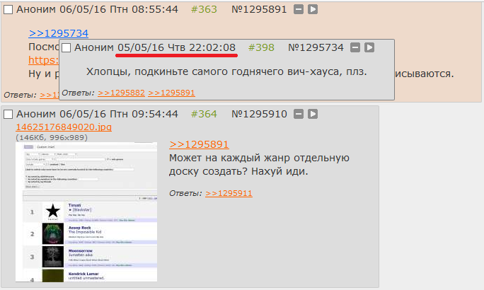 >>13576 Пост в музаче на полчаса позже. Совпадение? Не думаю. Мне кажется ему просто бомбануло что либо здесь годноты не спалили, либо что в музаче никого из вичуганов нет и таким образом он хотел чтобы все перешли в музач. Еще ему нихуево бомбануло, когда я ему скинул ссылку на этот тред, лол.