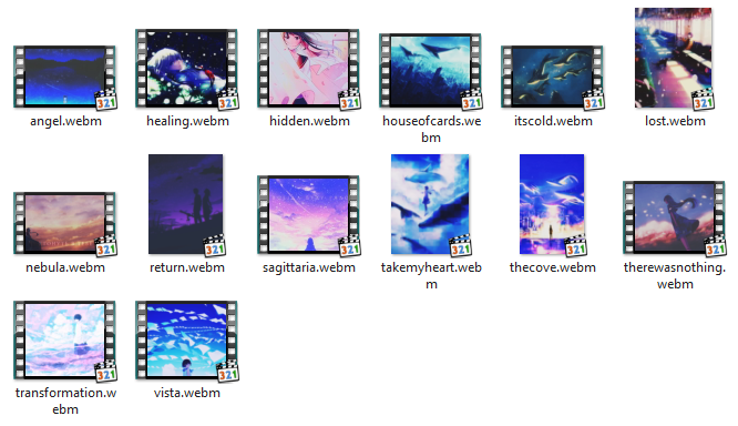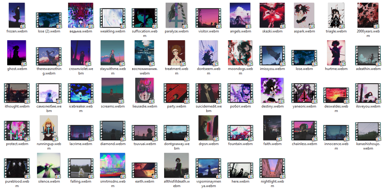 После перепроверки твоего скриншота и повторного поиска из всего списка твоих видео мне вообще не удалось найти и просмотреть: nightlight.webm, earth.webm и therewasnothing.webm; у меня нет источников мелодий из: hurtme.webm, paralyze.webm и suffocation.webm; в указанной папке нету: return.webm, healing.webm и наверняка еще много чего из нарезанного, если этот пост твой: https://2ch.hk/b/arch/2016-11-09/res/139636608.html#139639383, хотя это не удивительно.