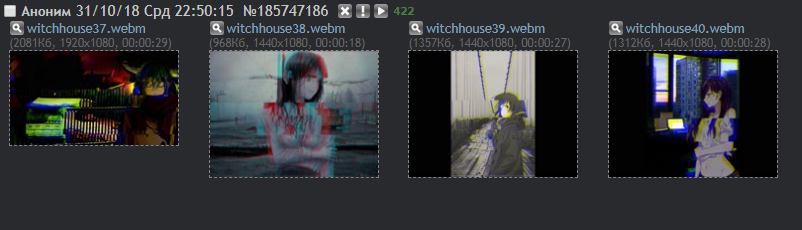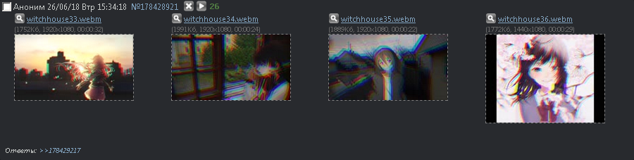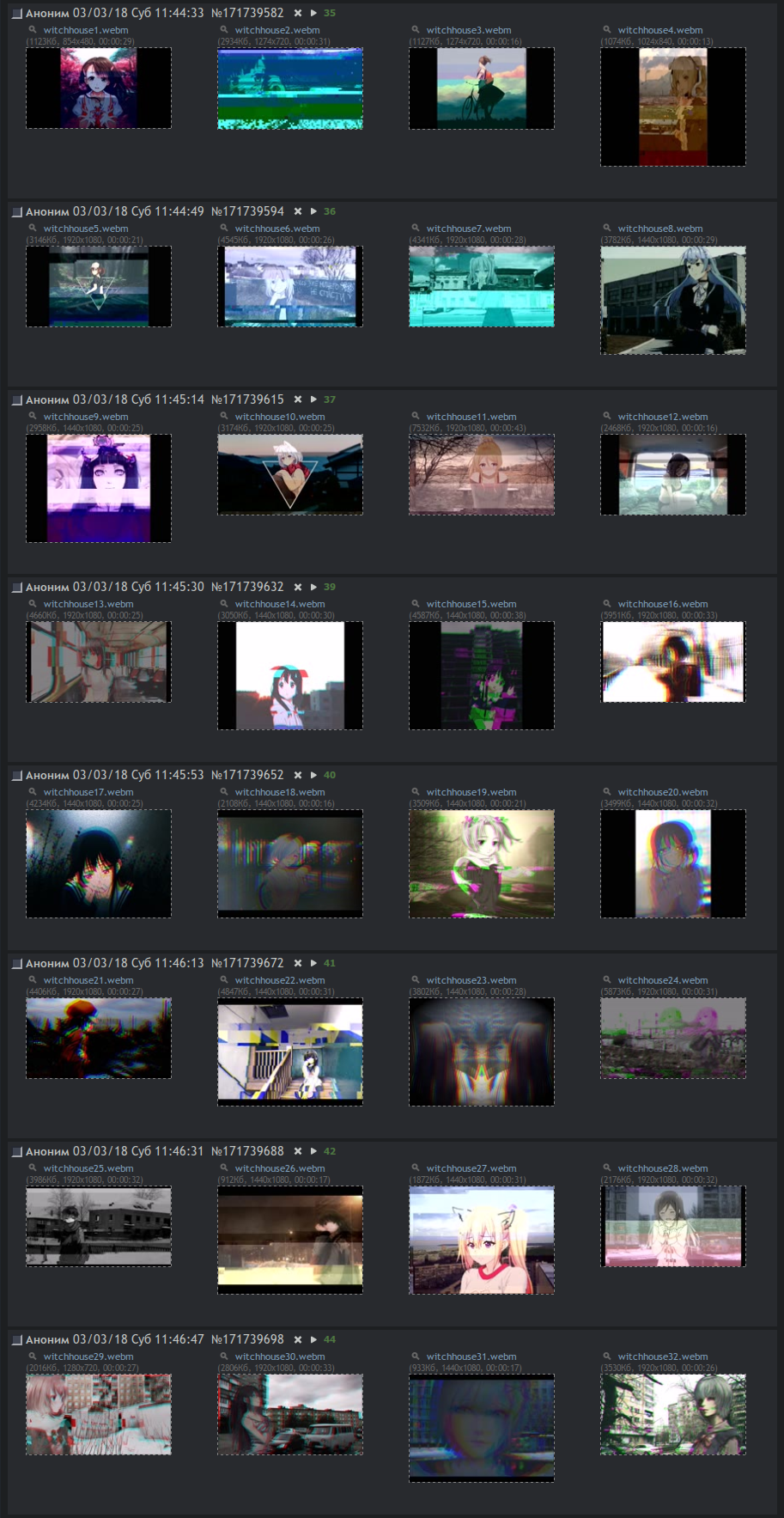 Обычно время моих публикаций приходилось очень поздно ночью, уже когда почти никто не заходил в музыкальные треды, а тем, кто заходили в основном такая музыка была не интересна. Хотя по моему местному времени еще было рано. Единственный день когда удавалось за всем проследить и запостить вебмки в нормальное время это мой выходной. Назад к моему ночному времени. В это время как раз появлялись так называемые грустнотреды, куда я иногда заглядывал. Туда часто загружали и грустную музыку. Для меня такая музыка в основном является эмбиент, есть очень много эмоциональных треков, которые я иногда и загружал наложенные под мой стиль картинок. В предыдущем скриншоте с вебмками с витчхаус и около-подобной музыки случайно попала такая вебмка с эмбиентом therewasnothing.webm. Прикрепил скриншот с остальными вебмками с эмбиентом.