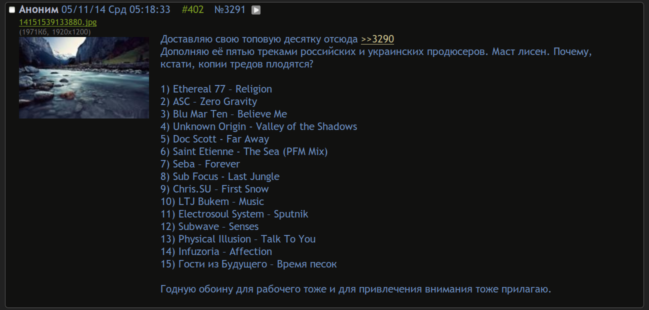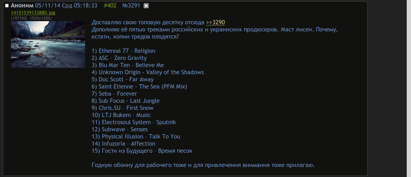 А вот мне нравится здешнее общение ютуб-ссылками. Сидят люди секущие в жанре и делятся годнотой. И так из года в год. Предлагаю так и оставить, а всю днб "элиту" переселить со всеми срачами в /dnb.