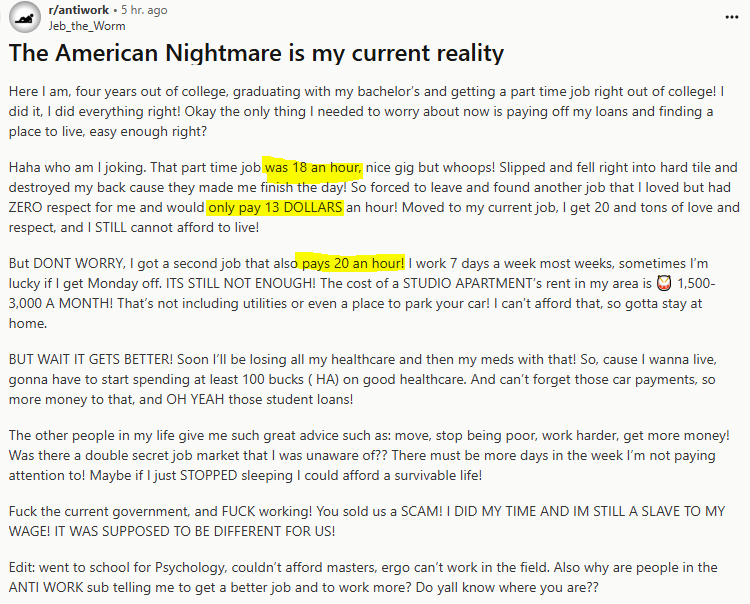 Там все дорого - медицина, образование, проживание, недвижимость, авто итд итп. Глубинарии любят сранивать цены на авто и дома не учитывая налоги+страховку+взносы+обслуживание. Можно купить авто за 10к и тебе выставят за него годовую страховку выше цены самого авто итд итп Ебейшие налоги на недвижку + взносы в ассоциацию домовладельцев итд итп