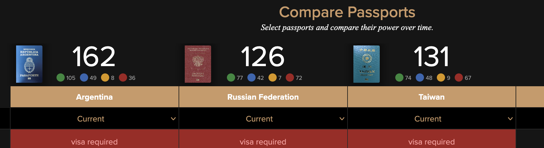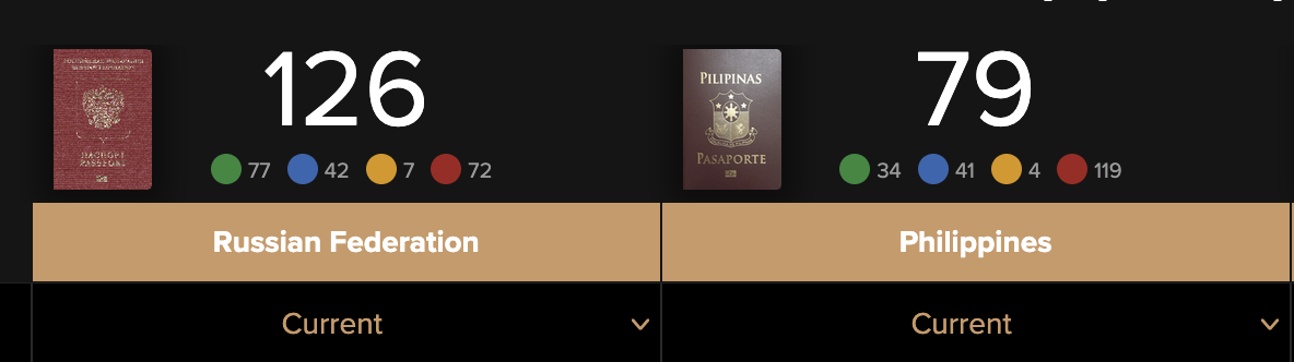 >>1188827 > естественное желание избавиться Ну вон у анона выше почему-то этого желания нет, возможно потому что есть уже другие гражданства в наличии. Если говорить про анона-россиянина в общем случае - у "токсичного актива" ограничений на поездки по миру сильно меньше чем у большинства азиатских стран, за исключением мест которые ты уже упомянул + топ-тир азиатских стран с сильным паспортом (Япония, Южная Корея, Малазия).