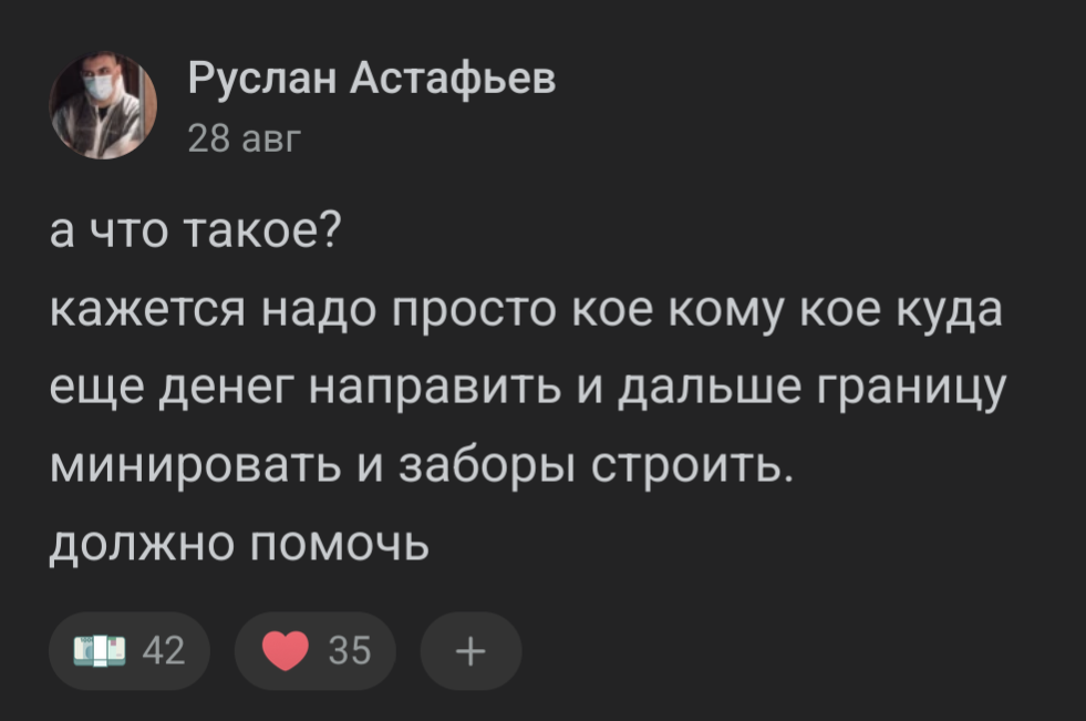 >>1230549 >топовый коммент на либерашьем виси.ру Чел, ты же вообще не шаришь! Топовый он потому что там много реакций и ответов, но топовая реакция это 💵 что намекает на проплаченный комментарий. Раньше не было реакций, но были + и -, его бы тупо загнали минусами вниз. Но теперь в топ выходит наброс говна на вентилятор.