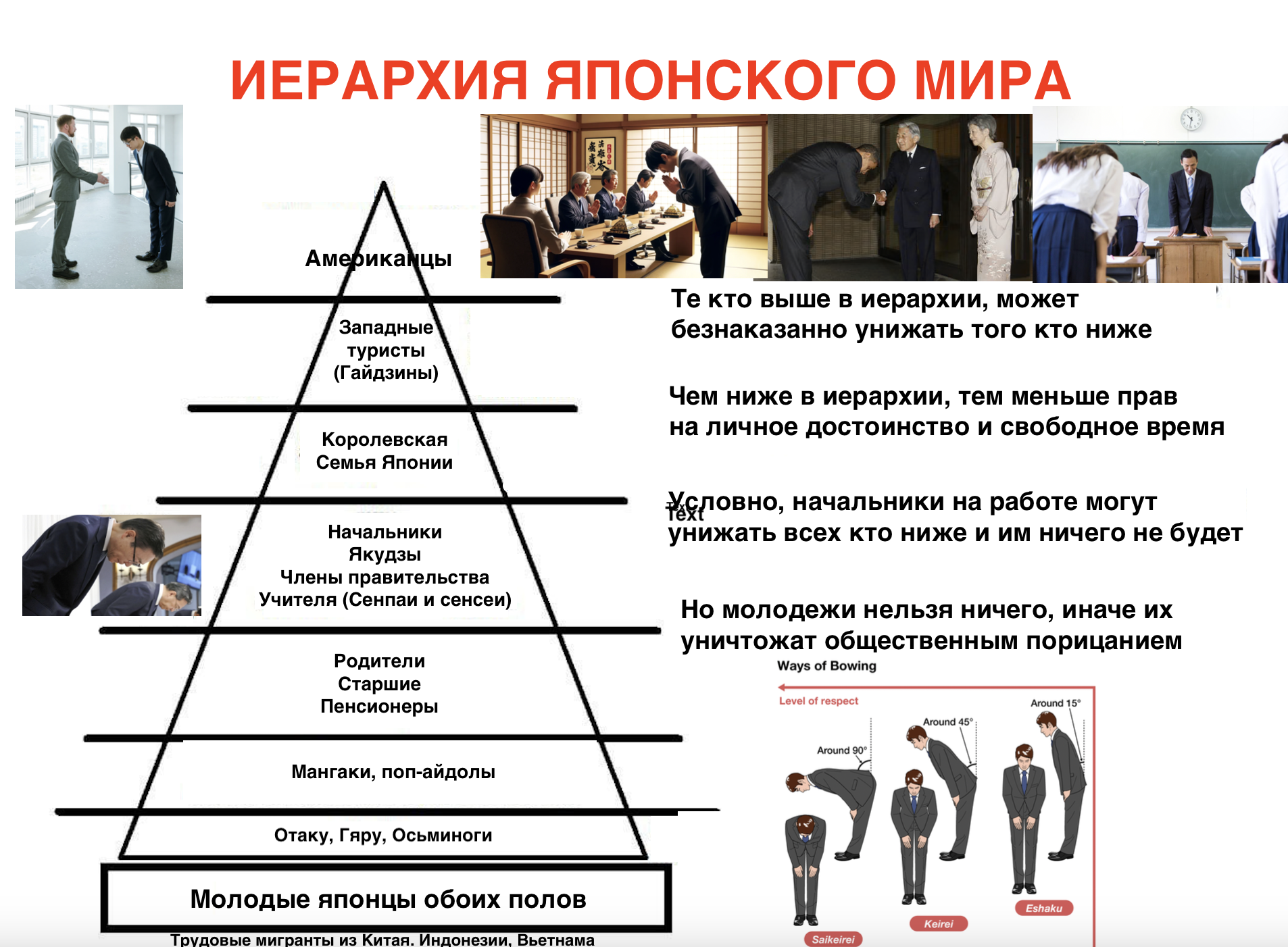 Значит так, блэкпилл по Японии: 1. Вне трех «главных» городов Токио, Осака и Киото большинство городов это очень унылые бетонные джунгли без особой эстетики или уюта. 2. Взрослая жизнь это на 80% работа и путь туда, подготовка к ней. В Японии это боль. Бесконечный ритуал унижения работников барином сенпаем, по праву сильного. Фантиков за это все уже и не так сильно заработаешь, зарплаты в Японии весьма низкие для страны 1. мира. 3. Японцы в крупных городах живут в микрочуланах с плохой изоляцией. Как и москвичи, в принципе, но во всех крупных городах. 4. Японское общество очень старое и село натурально загибается. Дома там ничего не стоят, но не находят покупателя, тк нет работы. Альтернатив жизни в миллионнике со всеми недостатками почти нет.