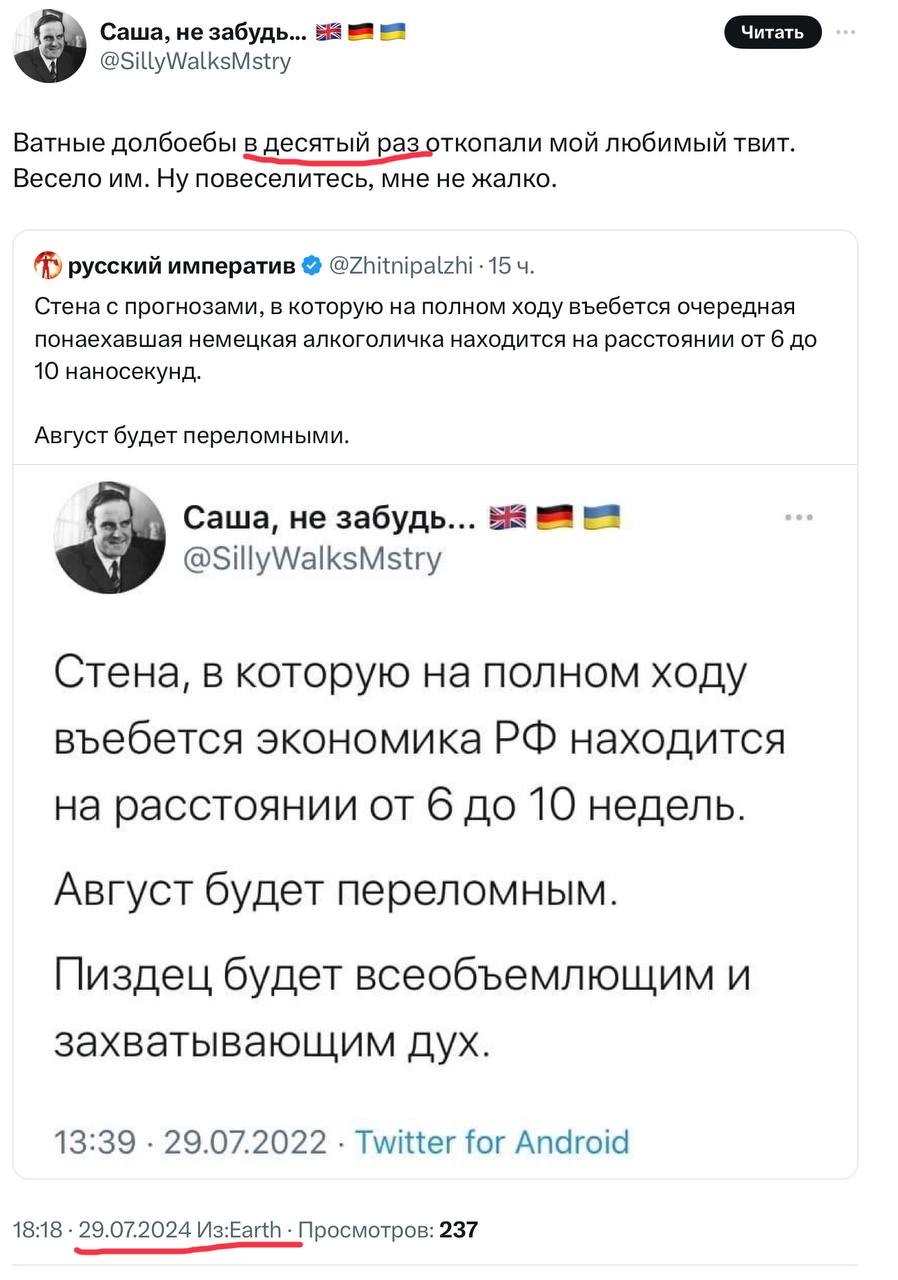 >>1210293 У меня есть работа, которая оставляет достаточно свободного времени. Нет, мне не похуй на степашек, я люблю свою страну и хочу жить в окружении подобных себе людей, жизнь среди мамбетов и гейропейцев возможна, но не так хороша конкретно для меня. К сожалению, при наличии совковых говноедов и подобной номенклатуры во власти в стране невозможен долгий период процветания и благополучия, но я разделяю власть и обывателей, хотя порой и возникает острое желание сказать "так вам и надо", продать всё и уехать в более благонадежные места. Что касается ВСУ, то для них я враг и мишень, они бы с кайфом ебанули по моему дому или домам моих родных из всех орудий, будь у них такая возможность, поэтому донатить им, будучи русским, сродни мазохизму, на мой взгляд. >>1210311 Правила зачастую противоречат друг другу, либо букве закона. В частности в отечественном бизнесе есть масса традиций, существующих как раз на уровне всеобщей базы, которые буквально нарушают закон, кроме того периодически появляются новые законы, превращающие старые обычаи в нарушения. Так что играть по правилам, конечно, приходится, но это не значит, что эти правила хороши или хотя бы приемлемы. >>1210323 Тем не менее родился вот, превратиться в кого-то другого не получилось, так и живу.