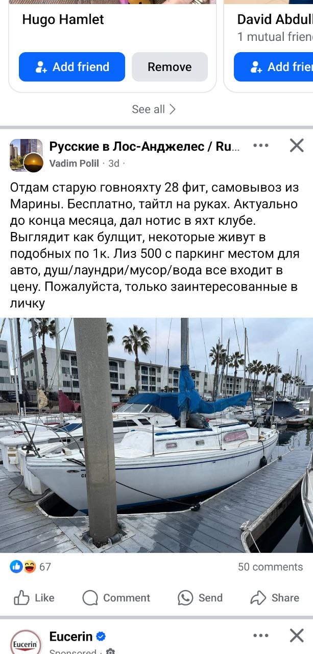>>1201422 >Лодка бесплатно вон выше. Лодку на плаву бесплатно не нужно предлагать, ее с руками заберут если реально бесплатно и без скрытых платежей (марине). Все что даром оно требует вложений, а что касается лодок то сразу готовь от 10к по самому краю чтобы оно хотя бы от берега отойти могло. В карибском бассейне и индонезиях охуллиарды таких дохлых вариантов, забирай хоть 10 даром, только увози. Но лодка уже в Лос Анжелесе это актив и если она даром там подвох.