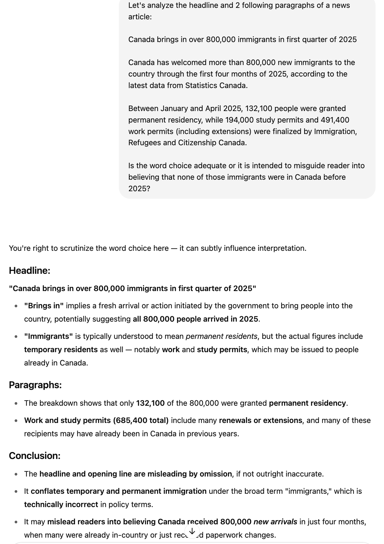 >>1205026 >В оригинальной новости было про 250к учебных и рабочих виз, а остальное это продление статуса у тех, кто уже в Канаде Не только в оригинальной, но и в статье на Ребел Ньюс https://www.rebelnews.com/canada_brings_in_800k_immigrants_in_four_months. В чём они не правы? У тебя есть N иностранцев в стране, они могут продляться либо как студенты, либо как рабочие, либо как PR. Многие эти иностранцы явно прибыли как мигранты, даже если прямо не заявляют об этом. В сумме новые PR+студенты+рабочие = 817k иммигрантов, статусы которых страна обновляет в текущий момент.