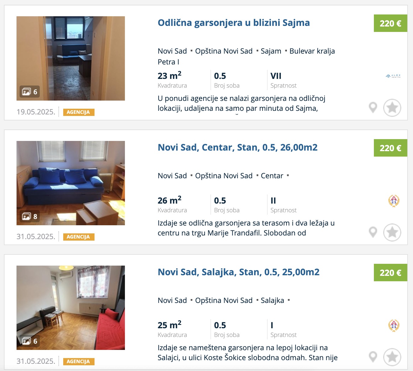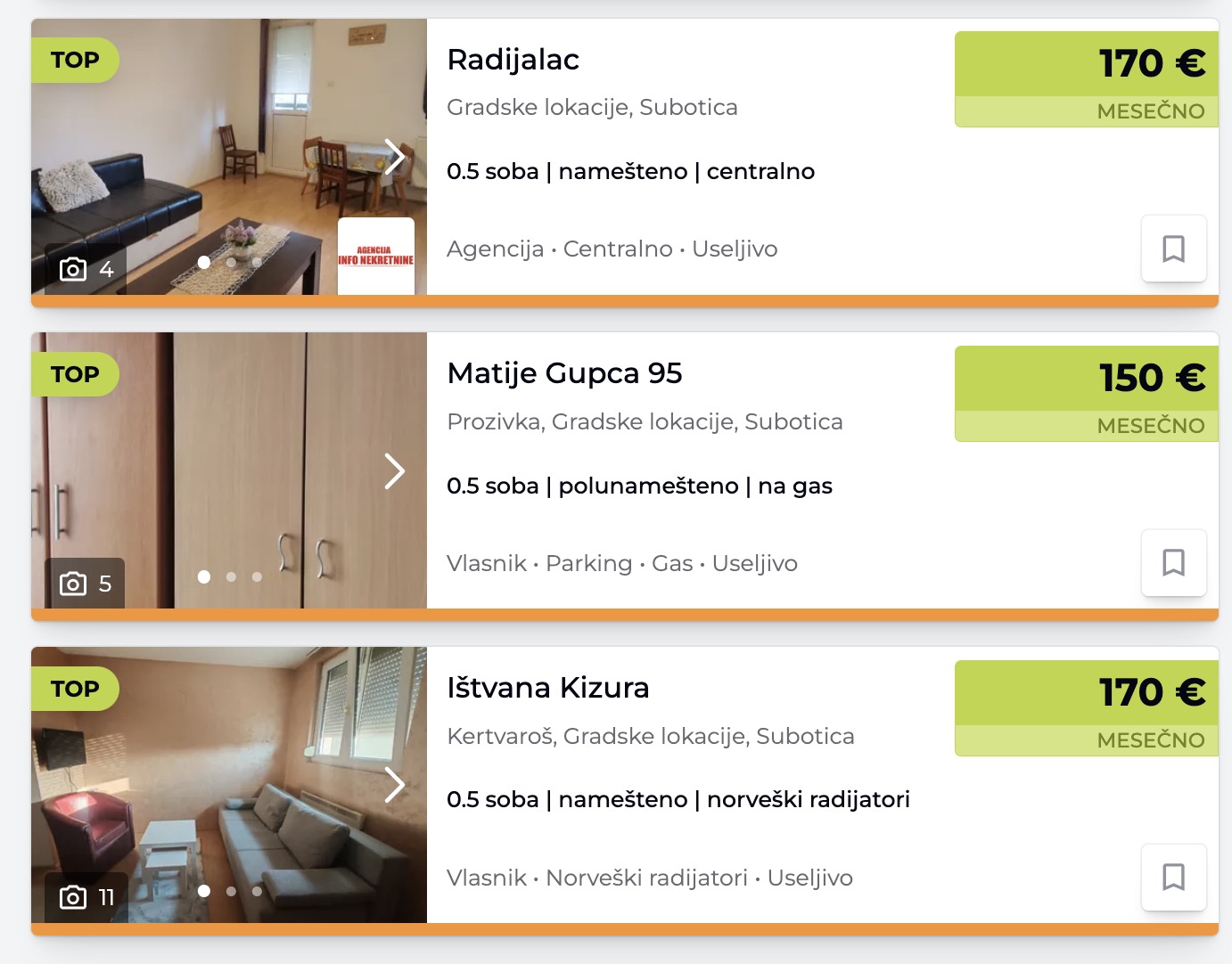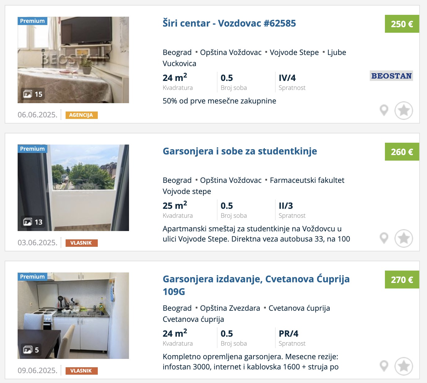Вот в этом пункте мне видится ошибочный подход к поиску жилья. В Белграде живет очень много сербских иногородних студентов и работяг. Наверное, на порядки больше, чем русскоязычных "релокантов". Немалая часть из них снимает комнаты в 2-3-4-комнатных квартирах, что получается дешевле, чем снимать 1-комн. квартирку в соло.