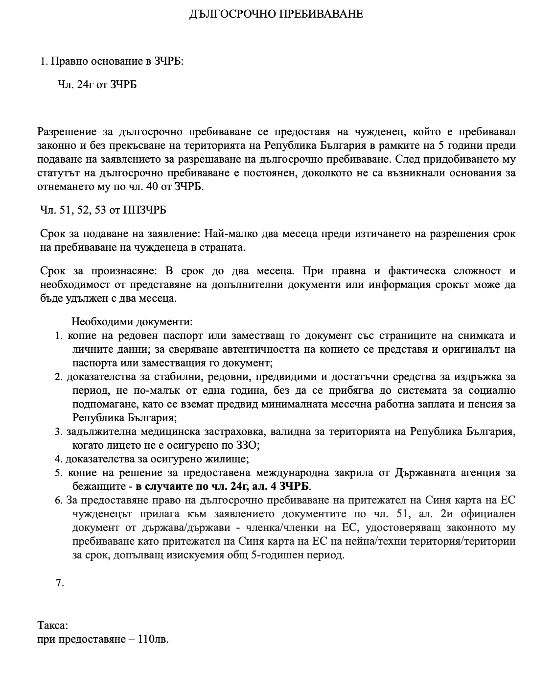>>1206554 Чл. 24д. (Нов — ДВ, бр. 9 от 2011 г.) (1) На чужденец, получил статут на дългосрочно пребиваващ, се издава разрешение за пребиваване на дългосрочно пребиваващ в Европейския съюз. Това разрешение е със срок на валидност 5 години, като при изтичането му се подновява след представяне на заявление. Изтичането на срока на разрешението за пребиваване на дългосрочно пребиваващ в Европейския съюз не е основание за отнемане или загуба на този статут.