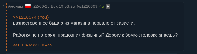 >>1210724 Так нихуя не делать на бюрги это не обязанность, а возможность. Если хочешь, можешь что угодно делать. Хоть на тайльцайт работать с компенсацией разницы до уровня пособий. Хоть фолльцайт. Хоть на аусбильбунг вписаться. Хоть закончить шпрахкурсы на уровни С и в универ поступить. Это возможность, понимаешь? А в пшекии ты не можешь не РАБотать, а у большинства хохланов тут супер скиллов и бумажек нет, и они реально РАБотают на всех этих складахзаводах, по сравнению с которыми стоять за свободной кассой в маке или жабке это ещё не так плохо. И все это за пшечью минималку. Я даже хз, кем надо брать, чтоб защищать и оправдывать это говноедство. Все мои лично знакомые хохланы, что жрут тут это говно и упахиваются - рсп, которые по факту просто прокатились в пшекию и у которых личинус не вывезет новой интеграции.