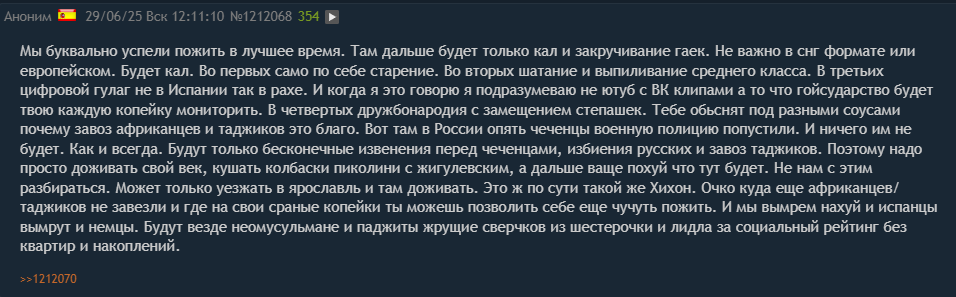 Я ещё заметила, что русы не только из-за общества в базированных парашах замыкаются в себе, они ещё и боятся, что их и за бугром российские спецслужбы достанут и добьются ареста или депортации. Даже в Сербии влияние русской гэбни велико, а уж в постсоветском мирке и подавно. Ну то есть, если в страну в принципу пускают русов, то она подпидорашенная по определению. Исключение — всякие далёкие нейтральные страны типа Японии, Таиланда, ОАЭ, но туда съёбывают совсем уж немногие.