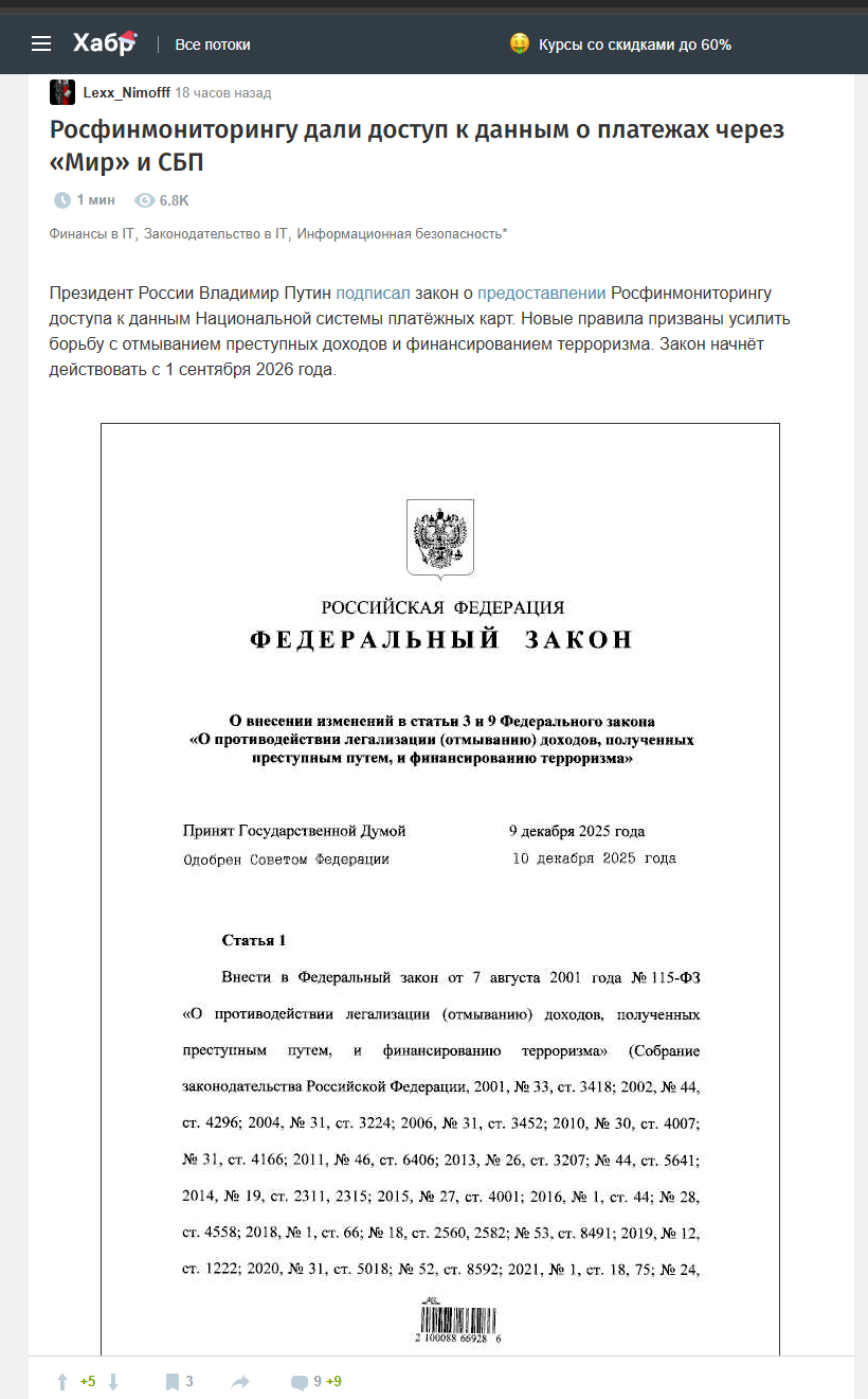 По новому закону Росфинмониторинг получает право «безвозмездно запрашивать у оператора НСПК сведения об операциях в сервисе быстрых платежей и операциях с платёжными картами». Информация будет передаваться через личный кабинет или другими способами, в том числе через единую систему межведомственного электронного взаимодействия. Конкретные параметры передачи данных установит соглашение между Росфинмониторингом и оператором НСПК, которое должен одобрить Центральный банк. В документе пропишут порядок, сроки, объём и состав передаваемых сведений.