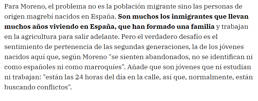 Одним из людей, который лучше всех знает историю Торре-Пачечо и его развитие, является Набиль Морено, президент мусульманской общины Торре-Пачеко, проживший в городе 25 лет. По мнению Морено, проблема заключается не в мигрантах, а в выходцах из Северной Африки, родившихся в Испании. Многие иммигранты живут в Испании уже много лет, создают семьи и работают в сельском хозяйстве, чтобы свести концы с концами. Но настоящая проблема — это чувство принадлежности второго поколения, молодых людей, родившихся здесь, которые, по словам Морено, «чувствуют себя брошенными; они не считают себя ни испанцами, ни марокканцами». Он добавляет, что эти молодые люди не учатся и не работают: «Они 24 часа в сутки проводят на улице, поэтому обычно ищут себе неприятности».