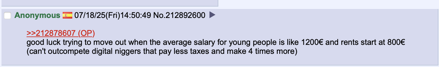 >>1217459 Чертовы инфантилы испанские, работать не хотят. Тем временем : средняя зарплата для молодых людей в Испании - 750-750 евро после вычета социалки средняя цена съема однухи - 1000-1100 евро