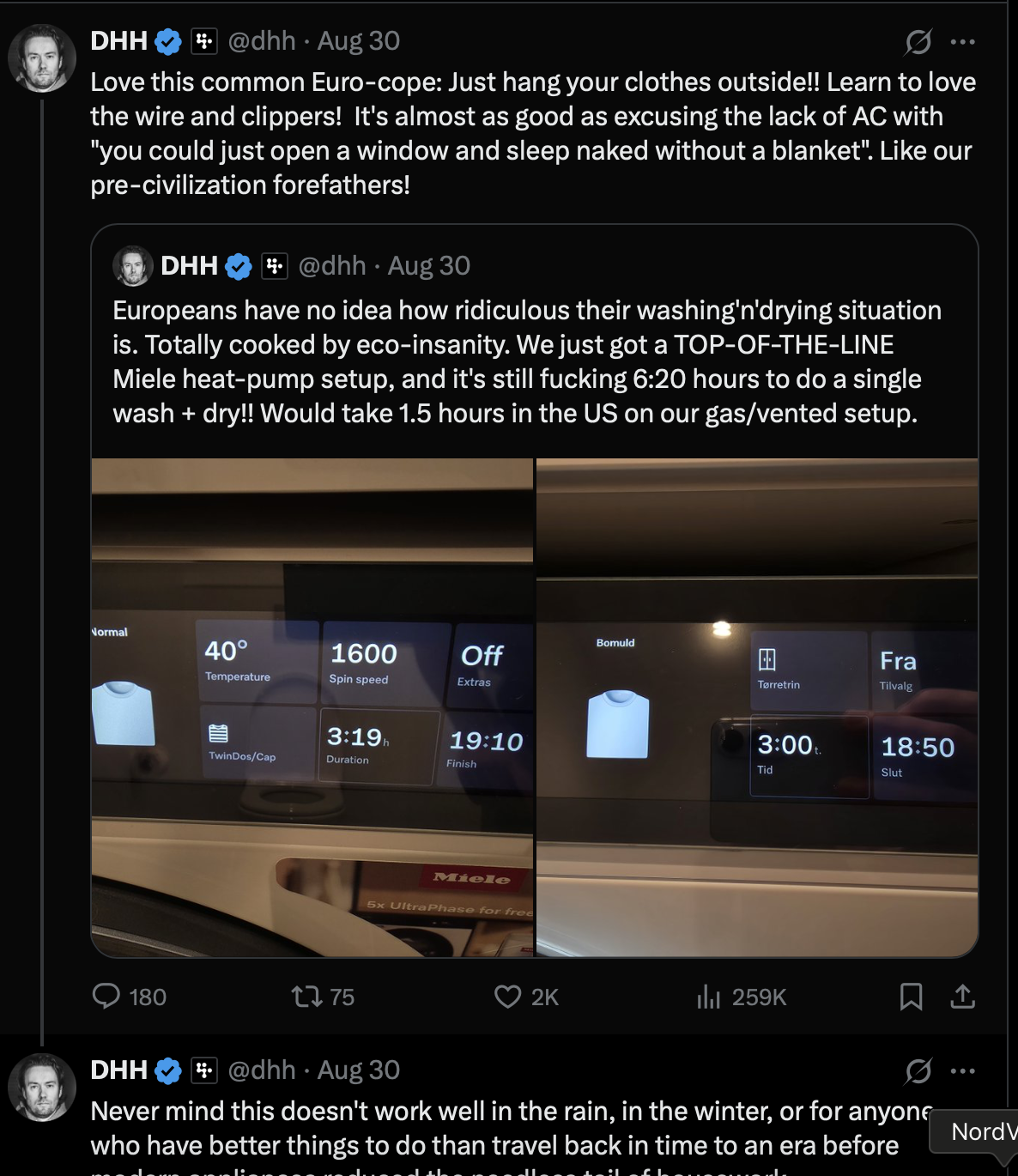 Вот недавно улыбнулся с DHH, который Датчанин но 20 лет прожил в США создатель руби он рейлс, так он в ахуе от отсуствия нормальных сушилок в ЕС. Их просто не купить из за эко куколдизма и куколд комисии.
