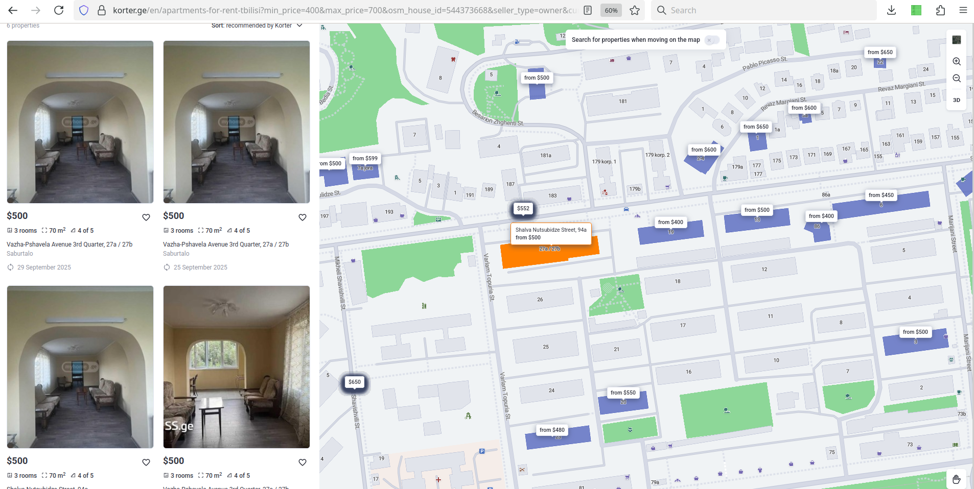 >>1250503 >Есть же сайты навроде korter.ge, предоплата, заезд. Как и везде тащемта. Посмотрел. 99% объяв — это какие-то риэлторы аля "размещено в 20:45, обновлено в 21:30", первые 50 страниц этой хуйней завалены вусмерть — пикрил. На myhome.ge чтобы открыть седьмую страницу результата поиска или N-ный номере телефона нужно залогиниться. На ss.ge есть прикольные штуки для отслеживания чепушил, но они платные. Пиздец, у меня голова кругом от этой хуйни. Прям вспоминается аэропорта "такси! такси! дарагой куда подвезти? сразу цену на месте скажу".