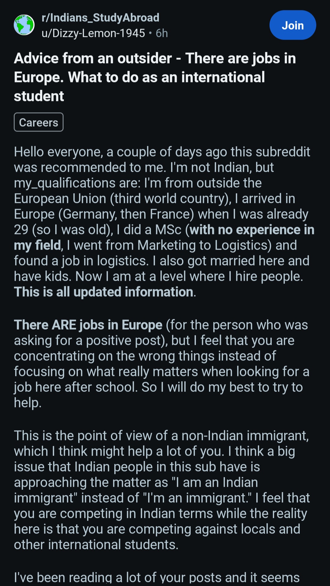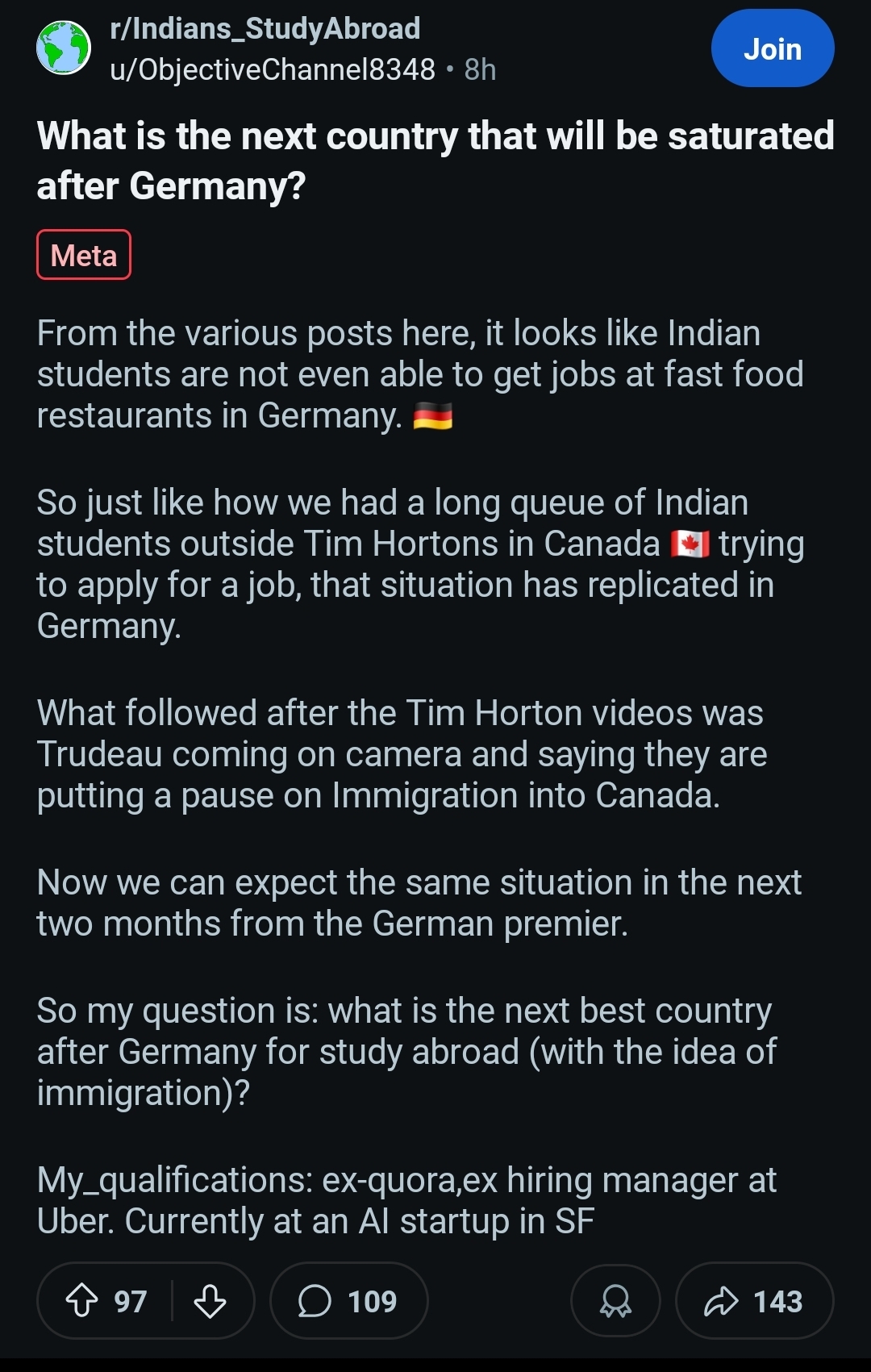 >>1230013 >Что эти индусы вообще ожидали? Что типо в бигтехе найдут работу на английском? Типо того. Раньше в Германии с этим попроще было и хайрили людей без немецкого языка. Сейчас рынок стух и хайрят только с нейтив дойчем, остальные за бортом остаются. Ну а эти индусы начинали учиться на айти в вузиках как раз либо до ковида, либо в 20-21 годах, когда хайр еще был. И видимо мечтали о перекате в европку через айти. Но не фортануло и теперь у них всех жопа просто синим пламенем полыхает и на реддите каждый день десятки постов про это.