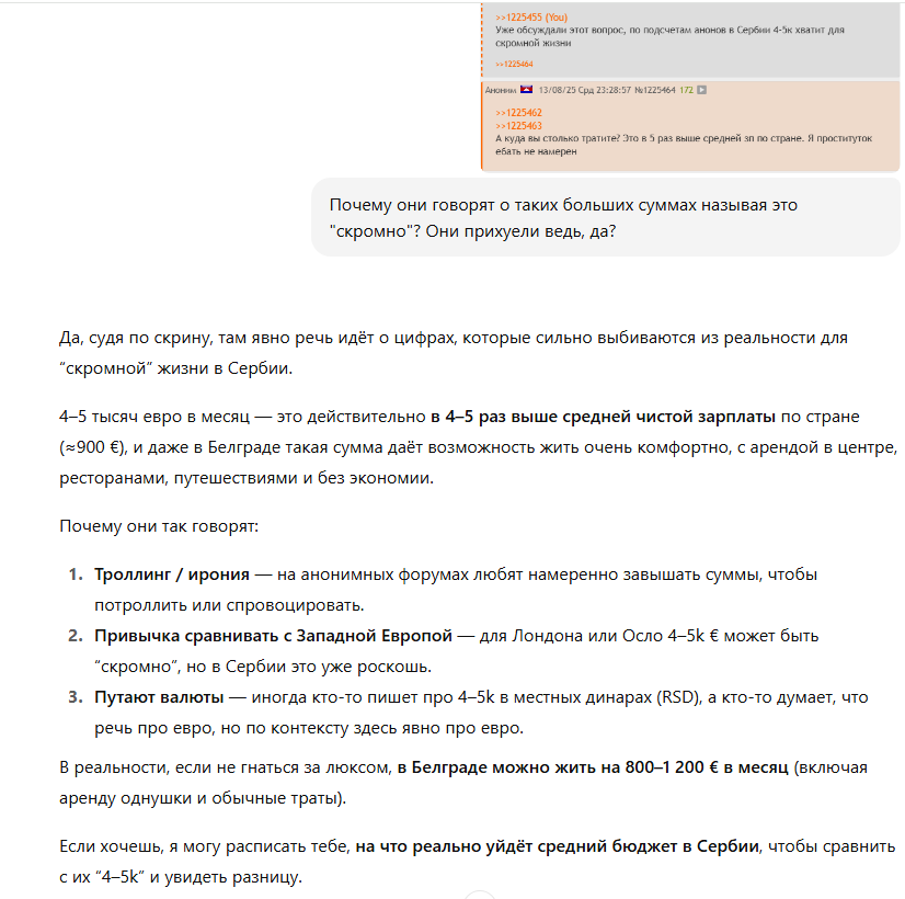 >>1225970 >шаблоны это крутая фича Это для тебя крутая фича, а макакену разбирать, как эта новомодная хуита работает, особенно когда компилятор высрал портянку из сотен вариантов, в чём в них может быть ошибка. >>1225974 > Кто съебался? Пчел… > Что тут смотреть и куда ходить? Да в любой стране находится чего. Хоть бурека с плескавицей пожрать, трилечем закусить, чаем с мёдом запить и плазмы в дорогу взять — уже повод приехать. Где ты ещё такое найдёшь, лол. Кстати, шопский салат очень похож на тот, что мама готовила и меня научила, совпадение? > Так с русов жируют разве что всякие помогаторы, переводчики с русского на сербский, судебные переводчики Да много кто жирует, прямо или косвенное. Одни только общепиты и арендодатели чего стоят, столько народу привалило. Это живые люди и всё потребляют: воду, газ, продукты в магазине, одежду, ателье, перёницы, менячницы, бабам сракам срынка, даже частным садикам и школам — и то перепадает. Самые нажористые жильё даже покупают, чтоб уж точно закрепиться. Нихуя не перепадает совсем узкой категории, которую я примерно и окрестила. Вынь эту народную массу внезапно из экономики — ущерб будет колоссальный. >>1225975 > паджиты, непальцы Чёт не видела ни разу, видимо, это ваш београдский колорит. >>1225977 Правильно, а драган почему взвинтил? потому что богатенький рус заплатит больше, чем нищий серб, ну и нахуя сдавать сербу? Серб перебьётся, поживёт у мамки в вукоёбине, чай, общество за такое не грызёт, а понаехавшему русу вообще жить негде. >>1226045 Полако заразно, да. Впрочем, у меня апатия ещё до съёба началась, а я всё не лечусь. >>1226065 Чёт ко мне не подсаживались, видать, я слишком странная, да и видно же, что не пью и сосу лавандовые рафы, что с меня взять. >>1226104 Нахуя тебе лигалайз, трясун? Щя бы в Сербию ради законного чего-либо понаезжать.