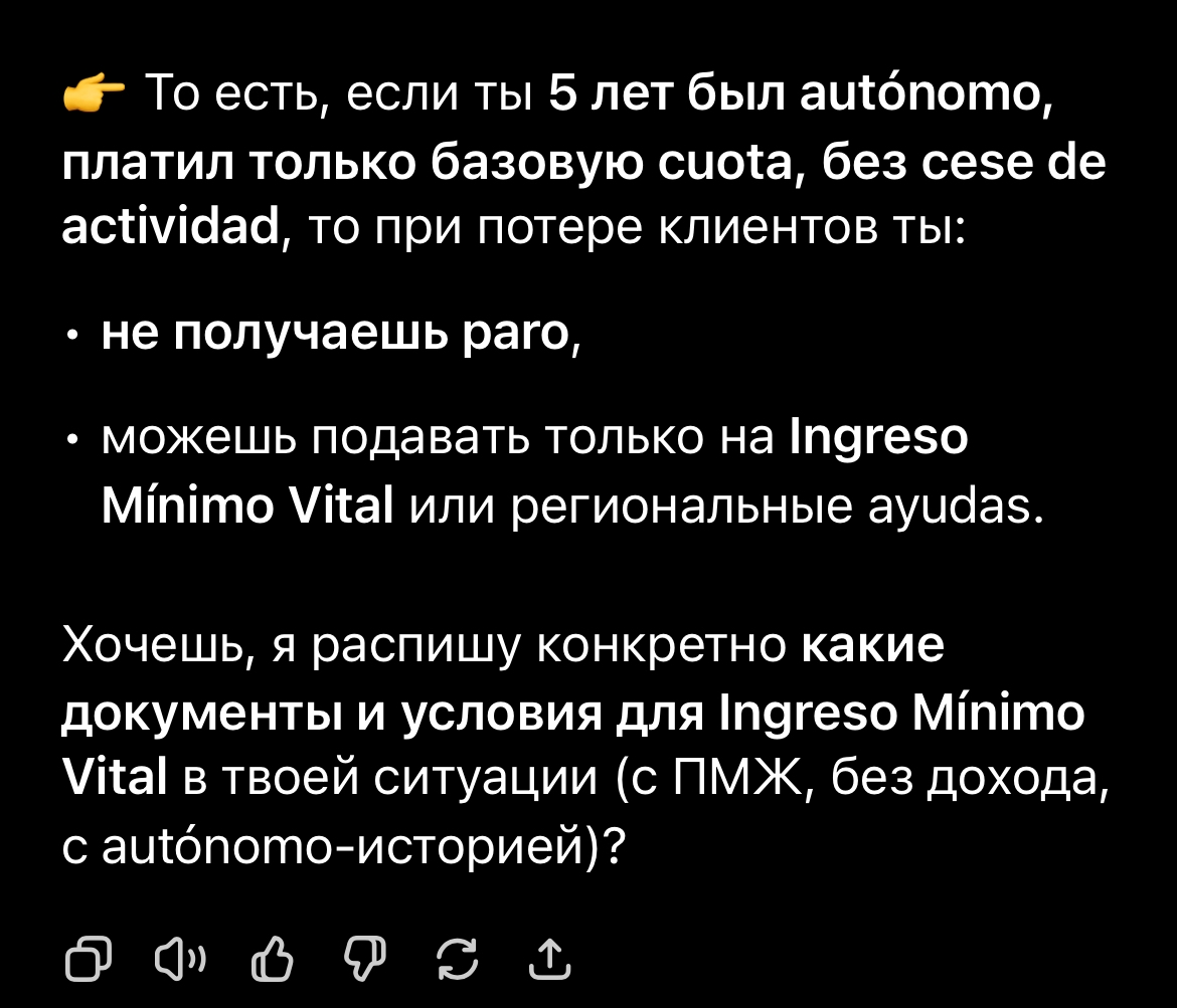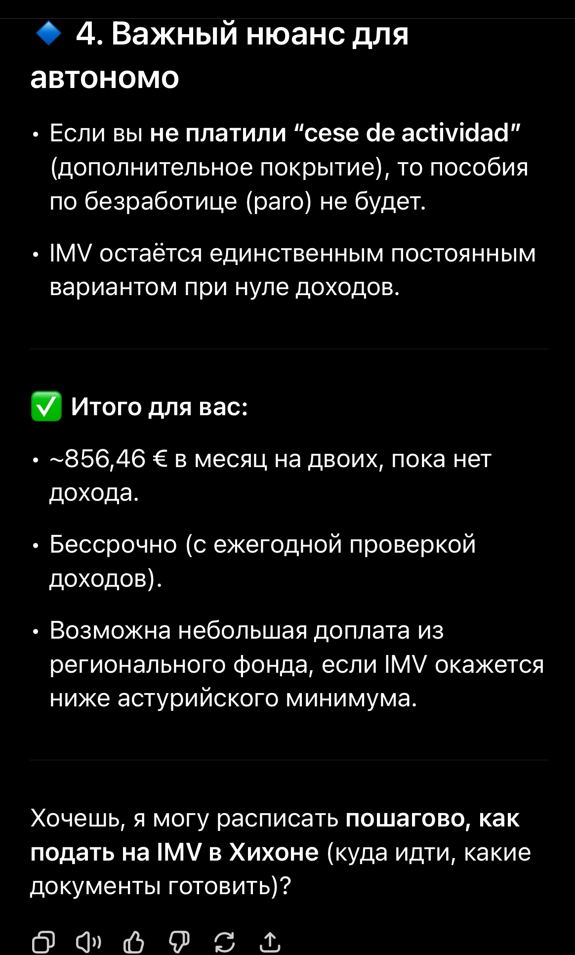 Тоесть чтобы получать пособие именно по безработице так называемый паро я должен ЕЩЕ дополнительно платить ЕЩЕ специальные соц отчисления. Тоесть 590 евро социал сегуридада недостаточно от аутономы. Надо ЕЩЕ. Претендовать можно только на выплату как малоимущий. Не то чтобы я претендовал но повод задуматься как испанское государство будет соц выплаты за щеку отсыпать после таких конских налогов. Надо вообще у Овьедо скуфа поспрашивать. А то чат жпт такой себе источник информации.