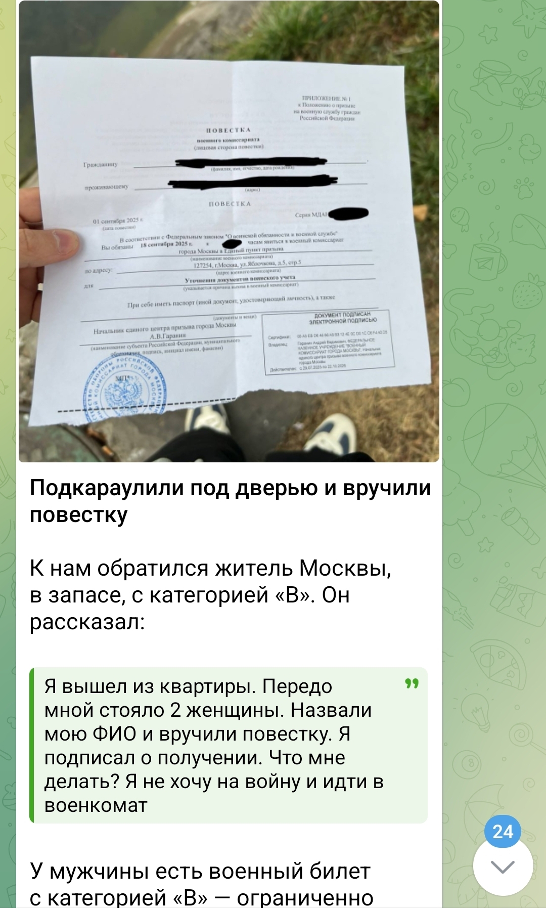 >>1236523 Так прецедента нет, потому что электронные повестки существуют только 1.5 года и пока что рассылались только в Москве в прошлые призывы. И там уже приходили штрафы на mos.ru за неявку по электронной повестке. А спамить повестками или нет - это целиком и полностью право военкомата.