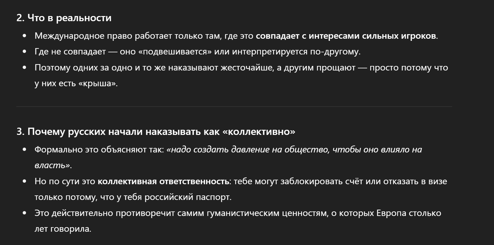 >>1236605 Так везде пишут что хамас просто террористы которые палестинских мальчиков в трусиках держат в страхе. Почему на азеров за Карабах не наложили санкции? Они отгрызли часть чужого государства. В сети ходили видосы где они обоссывали трупы армян в ямах каких то. Ну а так можно и про раху сказать что они там защищали своих мальчиков на Донбасе которых безбожно убивали с 14 года неонацисты которые захватили власть в киеве. Что дальше? Я так понимаю справедливость ебения и санкционирования зависит от воли трактующего эту справедливость? Ну вот сша и Европа по праву сильного посчитали что раху надо попустить. Что раха может расшириться и ее надо давить, а Израиль это точка влияния сша на ближнем востоке (военные базы, разведка) и ни на какую Молдавию и Прибалтику он не расширится. Ну а справедливостью этой залупу как обычно вытрут и вам расскажут что справедливо. Ну а вы тут будете сидеть спорить что справедливо а что нет.