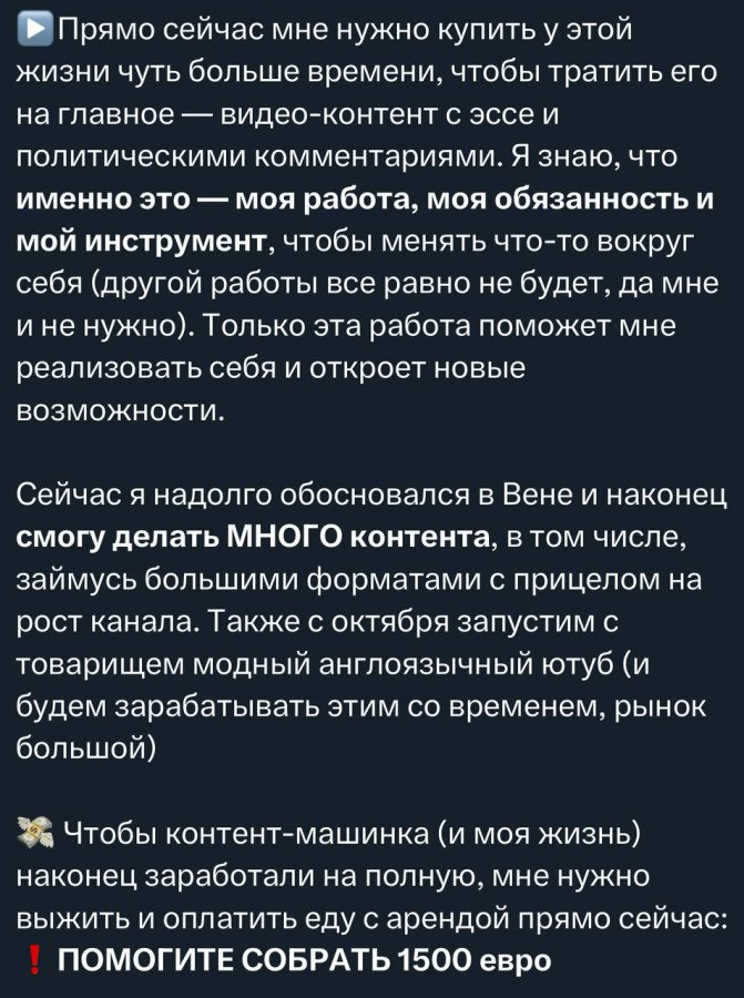 "У меня серьёзные проблемы : нет денег на еду и аренду жилья. Прямо сейчас мне нужно купить у этой жизни чуть больше времени, чтобы тратить его на главное — видео-контент с эссе и политические комментарии. Помогите собрать 1500 евро" https://t.me/boris_rozhin/180112