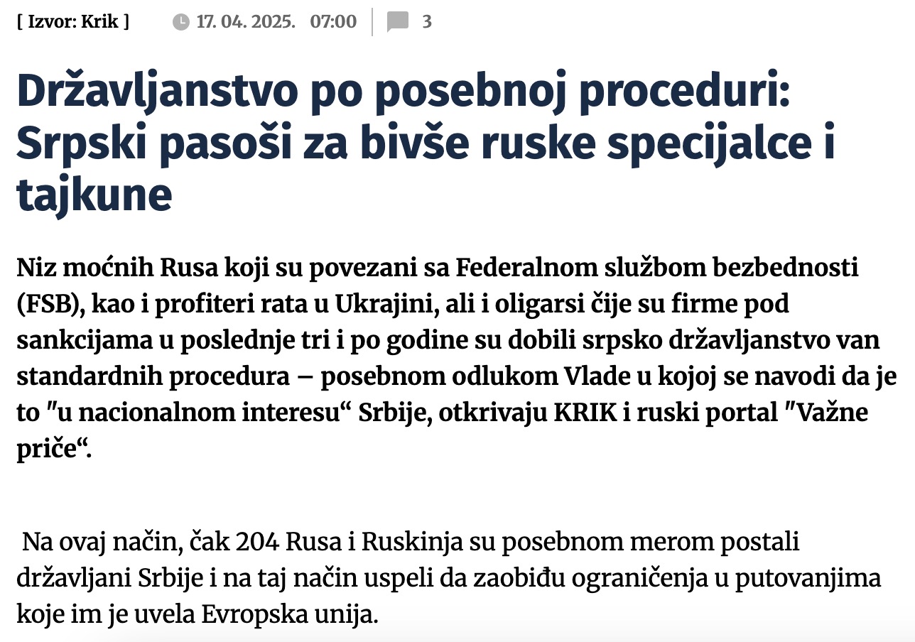>>1238368 Им пасоши выдали просто так, даже без отказа от российских. Я подозреваю, что там тупо Пыня на стол Вучичу положил список тех, кому паспорта сербские надо выдать, в обмен на скидки на газ. И Вучич выдал паспорта людям, которые никак с Сербией не связаны и вероятно никогда в ней даже не были. Балканы, хуле.