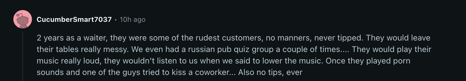 >>1237870 Такие люди есть конечно, но в целом это скорее стереотип. Ходить исключительно в русские оверпрайс рыгаловки это хз кем надо быть.