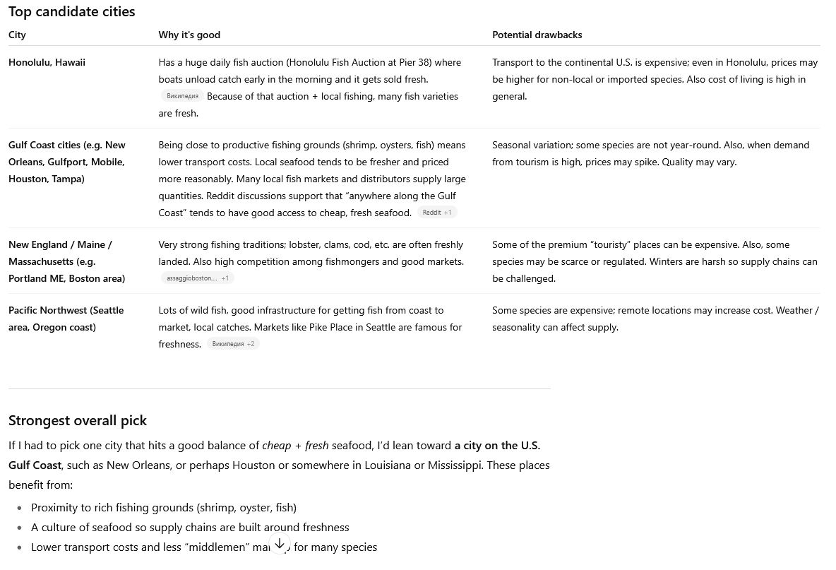>>1239446 >задешево Ты неправильно ставишь вопрос. Морепродукты в США во всех крупных городах есть, но тебе нужно искать такой город где позволит зп есть их каждый день. С дивана предположу что это Калифорния, NYC, либо Чикаго. Если прямо свежие и только выловленные то тут уже в рыбалку нужно вкатываться