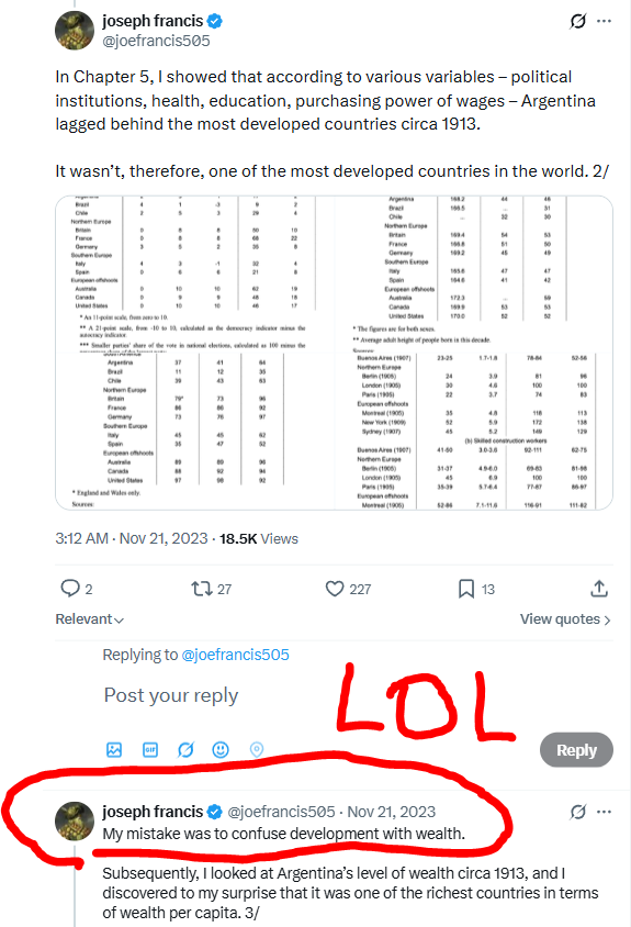 >>1280613 >Я принес тебе факты, собранные из архивов челом Ты нагуглил твит чела, а дальше забыл прочитать, что вторым твитом этот же самый чел пишет, что ой, кстати, обосрался, I MADE A MISTAKE: Аргентина была топовым государством по уровню благосостояния на единицу населения.