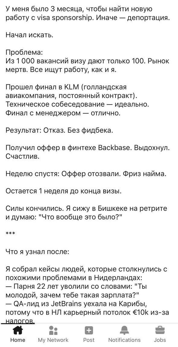 Да, такое бывает, но редко, и ну да это сразу гг вп чемодан и домой. Я был готов к этому когда переезжал, но я все успел. Был готов к этому, когда понял, что стартап, где я рабоотаю, дышит на ладан, но я начал искать работу заблаговременно, и удачно получил оффер в ту же неделю, в которую нас лейоффнули. Товарищ поступил примерно так же, но начал искать позже, и получил оффер позже. Но он хотел больше денег и пошел контрактором, а у него в это время была несчастная любовь и он постоянно ебланил, в итоге его выгнали через несколько месяцев за андерперформанс. Короче ничего удивительного и не показательно, ни история челика с линкедина, ни моя.