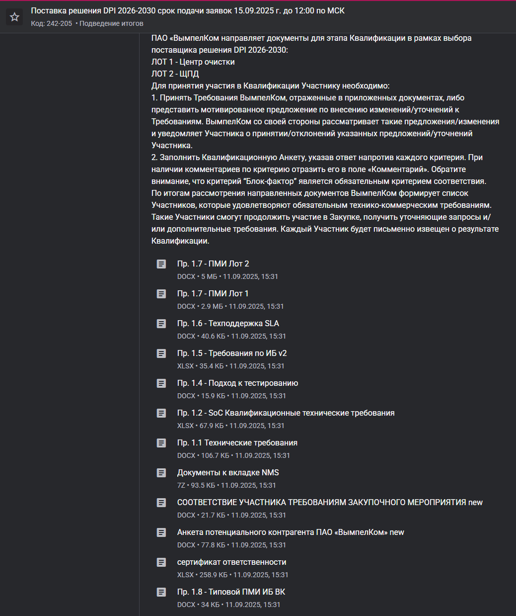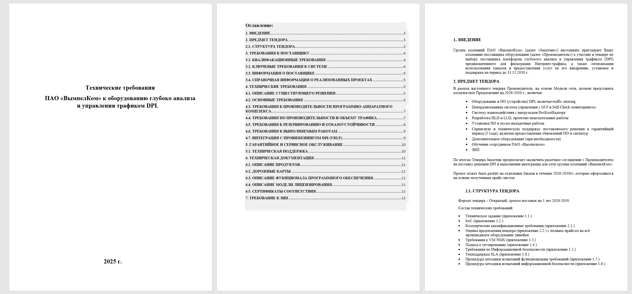 Группа компаний ПАО «ВымпелКом» настоящим приглашает Вашу компанию-поставщика оборудования к участию в тендере по выбору поставщика платформы глубокого анализа и управления трафиком (DPI) предназначенного для фильтрации Интернет-трафика, а также оптимизации использования каналов и предоставления услуг по его внедрению, установке и поддержке на период до 31.12.2030 г.