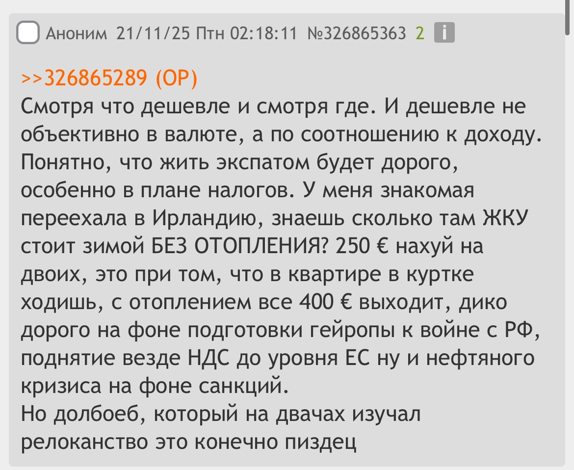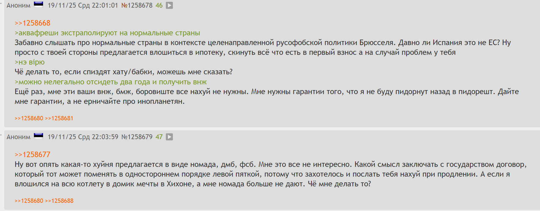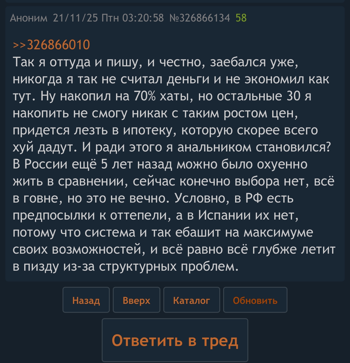 >>1258662 Я не понял, надо оправдаться за черногорию чи шо? Ну по делу я считаю что черногория хуевая страна как и сербия. Что там всех будут сливать и максимум который можно будет там вытянуть то это пмж в сербии, но не паспорт. Да и нахуй он нужен. Это было понятно и раньше. Я бы не стал жить в этих странах и лучше бы жил в россии если уж выбирать. По делу я не верю что людей имеющих легальные основания на проживание в испании а уж тем более с пмж или гражданством кинут через хуй в том числе с квартирами. По делу я считаю что ЭТО ДРУГОЕ. И таким образом иду на сознателный риск. Я верю в то что людям будут вставлять палки в колеса в прибалтике, но не верю что испания пойдет на что либо подобное. Я скорее верю что меня трахнет экономическая ситуация чем испания. Как я уже и говорил одной из причин выбора этой страны было в том числе ее либеральное отношение к перекатышам. Тут все еще можно нелегально отсидеть два года и получить на этой почве внж. Я не знаю где еще такое возможно. Хотя в нашем ебанутом мире ни в чем нельзя быть уверенным. Именно поэтому я пишу про риск а не про то что ЭТОГО НЕ МОЖЕТ БЫТЬ. Там вон инопланетяне к нам летят, и вв3 на пороге. Какие тут гарантии. Я думаю что аквафрешам очень хочется преисполниться в сделанном ими выборе и они экстраполируют логику шиткхоулов на другие нормальные страны чтобы в очередной раз показать что лучше россии страны нет для русского человека и что жить в россии это единственный правильный выбор.