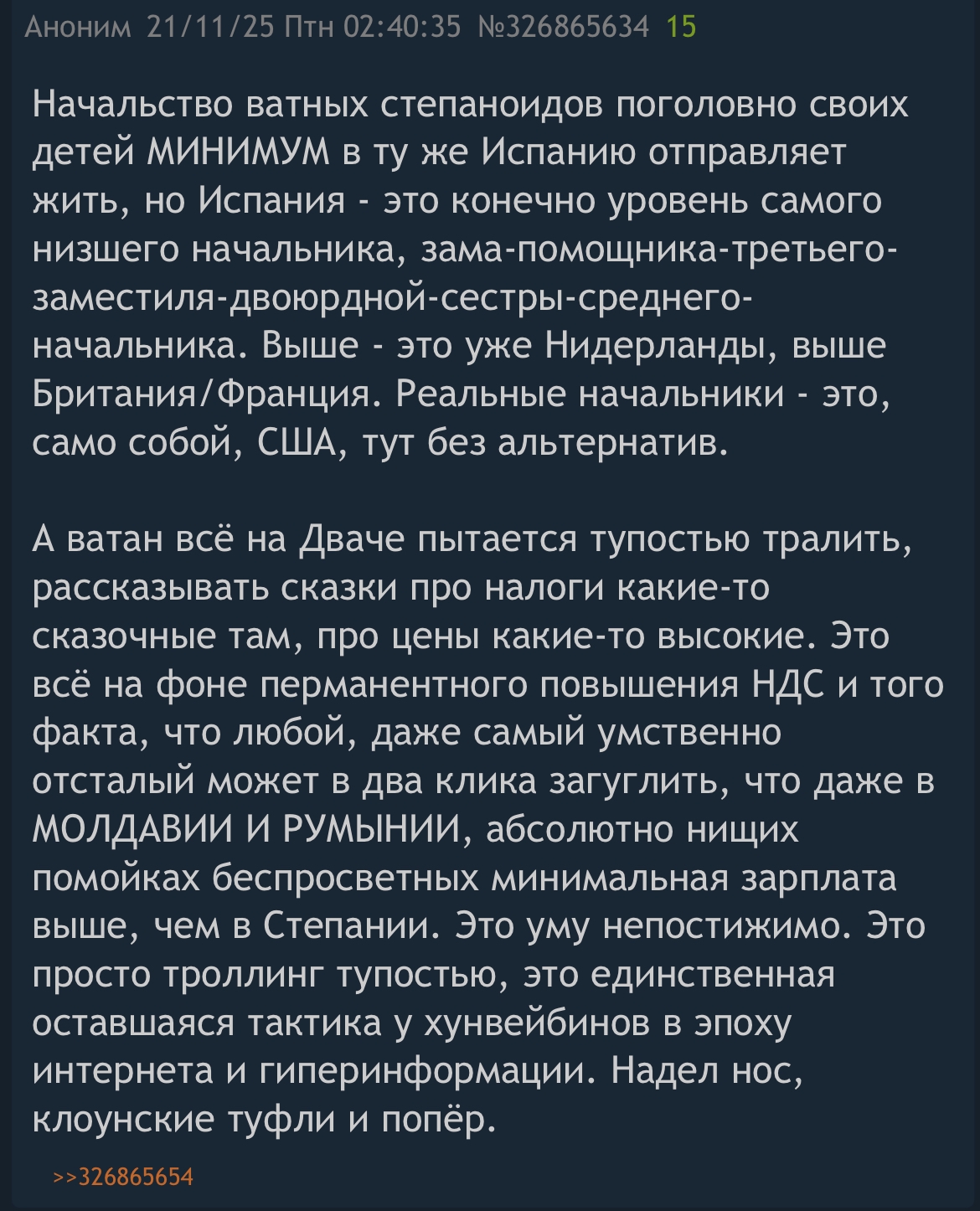 >>1258687 Все эти серёжи смирновы, мишатоковинины, хулиномики и дядявити это хуесосы из пидорахотуба крайне жёстко продающие каждый свое. Если ты ведешься на их хуцпу то ты туповат и так ничего и не понял прожив в этой стране долгие годы. Здесь только одно правило - СНГ это инфляционный концлагерь-колония и ты в ее пирамиде либо пидарохо-рантье либо нет. Если нет то убегай из этой колонии общего режима как только паспорт дадут. Никаких других вариантов нет не было и не будет. Все остальное из книжек по экономике к антиправовлй сырьевой колонии не применимо. Паспорт получил и беги из кпопрогулага добывать в мире ВНЖ нормального мира