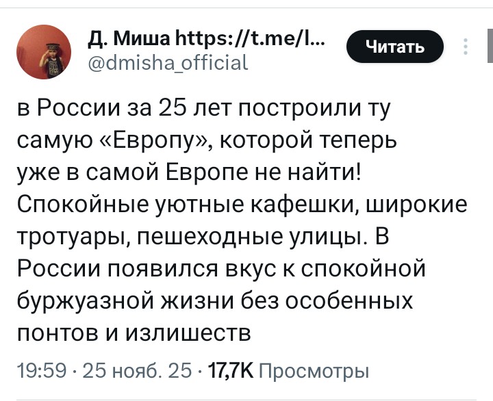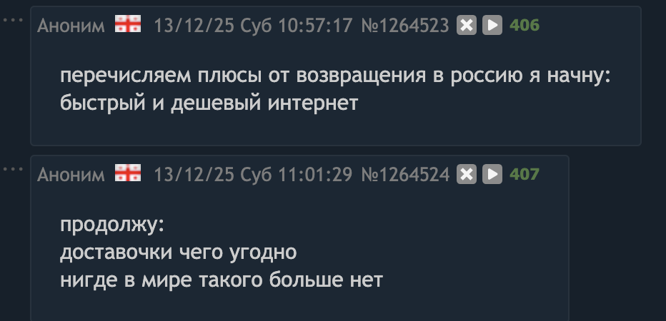Вернувшиеся и планирующие. Плюсы возвращения в Россию, которые чаще всего называют сами вернувшиеся релоканты (на основе их твитов, тредов, интервью и постов в X за 2023 - 2025 гг.): - Значительно более высокая зарплата и покупательная способность Многие IT-специалисты, маркетологи и менеджеры пишут, что в России они получают в 1,5 - 3 раза больше в долларах/евро, чем на аналогичной позиции в Армении, Грузии, Турции, Сербии или даже Польше и Прибалтике. - Низкие налоги и простая бухгалтерия 13 % НДФЛ или 6 % на УСН против 20 - 45 % в Европе + сложные отчёты. - Нет проблем с ВНЖ и визой Самая частая причина возврата - отказ в продлении ВНЖ, депортация или невозможность получить его дальше (Турция, Грузия, Сербия, Кипр, Германия). - Комфортная привычная среда - Русский язык везде - Родственники и друзья рядом - Знакомая еда, медицина, школы/детсады - Нет языкового и культурного барьера - Быстрое восстановление карьеры В России их сразу берут на работу (дефицит кадров), часто с повышением. За границей многие месяцами не могли найти ничего кроме низкооплачиваемой работы. - Качество жизни в крупных городах Москва и Питер часто называют лучше Берлина, Праги и Белграда по инфраструктуре, доставке, сервису, безопасности ночью. - Эмоциональное спокойствие и дом Многие пишут, что перестали чувствовать себя "гостем второго сорта", "вернулся и сразу выдохнул", "тут моя Родина". - Дешевле содержать семью, особенно с детьми: детсады, кружки, медицина, ипотека под 6–8 % (льготная), а не 4 - 7 % в евро, но с зарплатой в 10 раз ниже. - Развитый онлайн-банкинг и сервисы СБП, Мир Pay, Госуслуги, Яндекс - за границей этого просто нет в таком объёме и удобстве. - Реальная свобода передвижения внутри страны. Можно в любой момент поехать в любой город, на дачу, к родным без виз и границ. Соблюдайте правила бороды и законы РФ. Политота в /po.