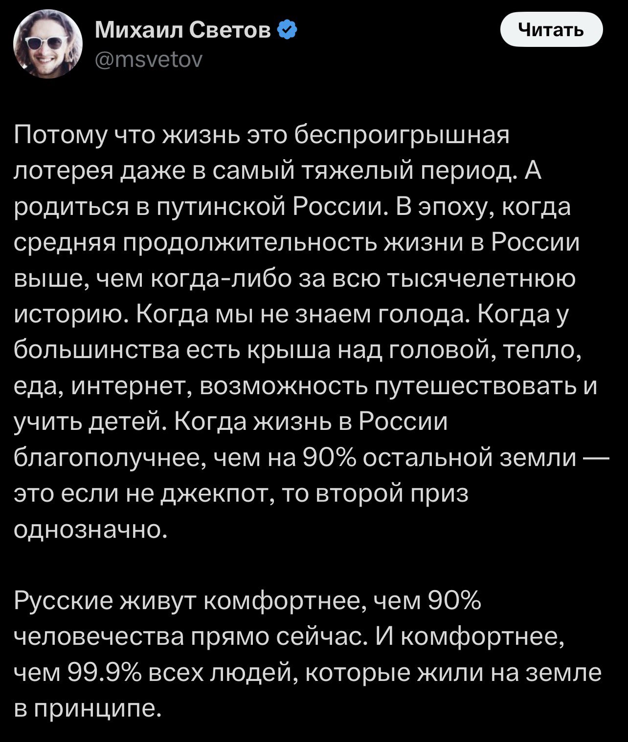 >>1262549 Ну ты тезисно давай, 78-аейскьюнный. Жилось ли 1000-200-100-50-20 лет назад лучше - нет, так что в рашке живется лучше, чем когда-то. Светка не напиздел. Живется ли в рашке лучше чем в 90% остального шарика - ну мб не в 90, а в 86 или 82, если в залупу лезть, но сути принципиально не меняет. Учитывая, что у нас 1.5 лярда в Африке, полтора в Индии, 700 лямов в ЛА, полтора в Китае, из которых лярд нищих, а еще всякие бангладеши с пакистанами и индонезиями с ираноираками еще ня лярд.