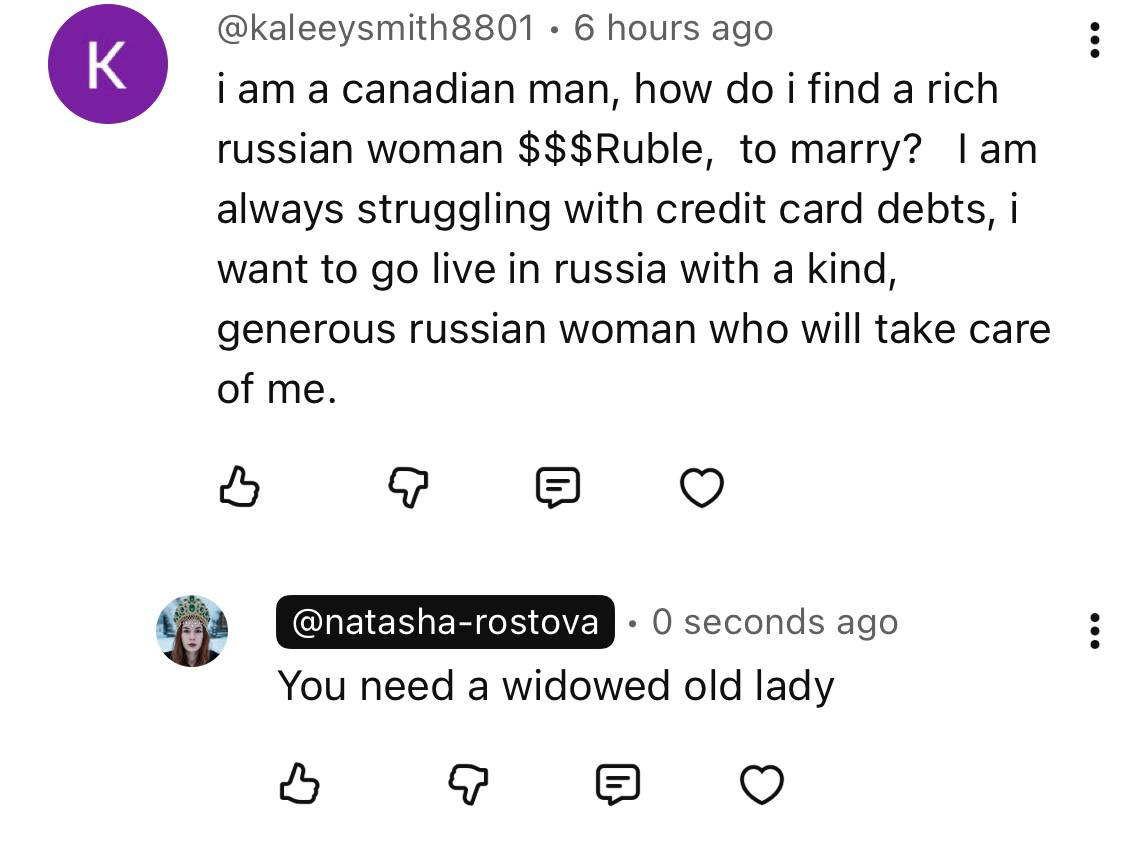 >>1267319 Лахта, в смысле довели? Канадец решил поторговать писечкой в надежде что дочурка губернатора Краснодарского края клюнет на канадский паспорт, засыпет подарками. В условиях фактической блокады блинолопатии вполне себе рабочий оффер и возможно это первые ласточки а явление наберет обороты. Паспорт ведь канадский не помешает, а залутать его иначе не получится.
