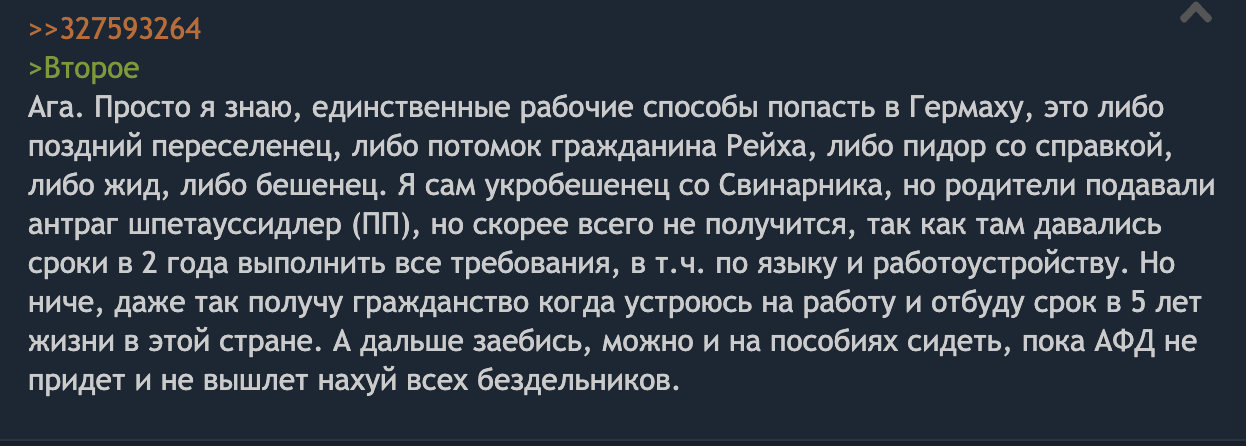 По русским немцам - без обид, но большинство из вас СЕЛЮКИ из казахстана, что НИХУЯ НЕ ЗНАЮТ ПРО РУССКУЮ КУЛЬТУРУ, и КОРЧЯТ ИЗ СЕБЯ ГАНСОВ, хотя ваш ебанный акцент слышен за 100 КМ, даже после того, как вы прожили 20-30-40 лет в ФРГ. Немцы вас считают НИ РЫБОЙ НИ МЯСОМ, а русские - КАКИМИ-ТО НЕДОРУССКИМИ. ИМХО, у вас был бы больше успех, если бы вы умяли свое ЭГО, и просто стали бы РУССКИМИ, русские бы приняли вас как родных. Но у вас ЭГО, хэрр Иван Мюллер, так что СКРИВИТЕ ЕБАЛО И ДОКАЗЫВАЙТЕ ДАЛЬШЕ, ЧТО ВЫ НЕМЦЫ лол Советую вам сгонять в Москау 2025 и посмотреть как живут номальные РУССКИЕ, которых вы так сильно презираете тут в Талахонии, думая, что везде срут из окна, как это было в вашей казахской деревне в 1999. А вообще вы ОЧЕНЬ СТРАННЫЕ, но да ладно, не все из вас с ЧСВ.
