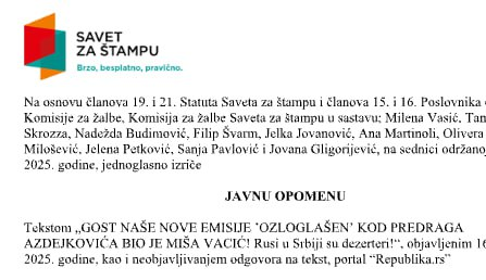 >Совет по печати Сербии вынес публичное предупреждение порталу „Republika.rs“ за распространение слов ненависти в адрес русских эмигрантов >Поводом стал выпуск с участием политика Миши Вачича, где он назвал русских в Сербии «дезертирами» и т. д. >Комиссия признала: >- нарушены нормы Кодекса журналистской этики. >- редакция не предоставила право на ответ и не внесла правки. >- допущена дискриминация и унижение человеческого достоинства.