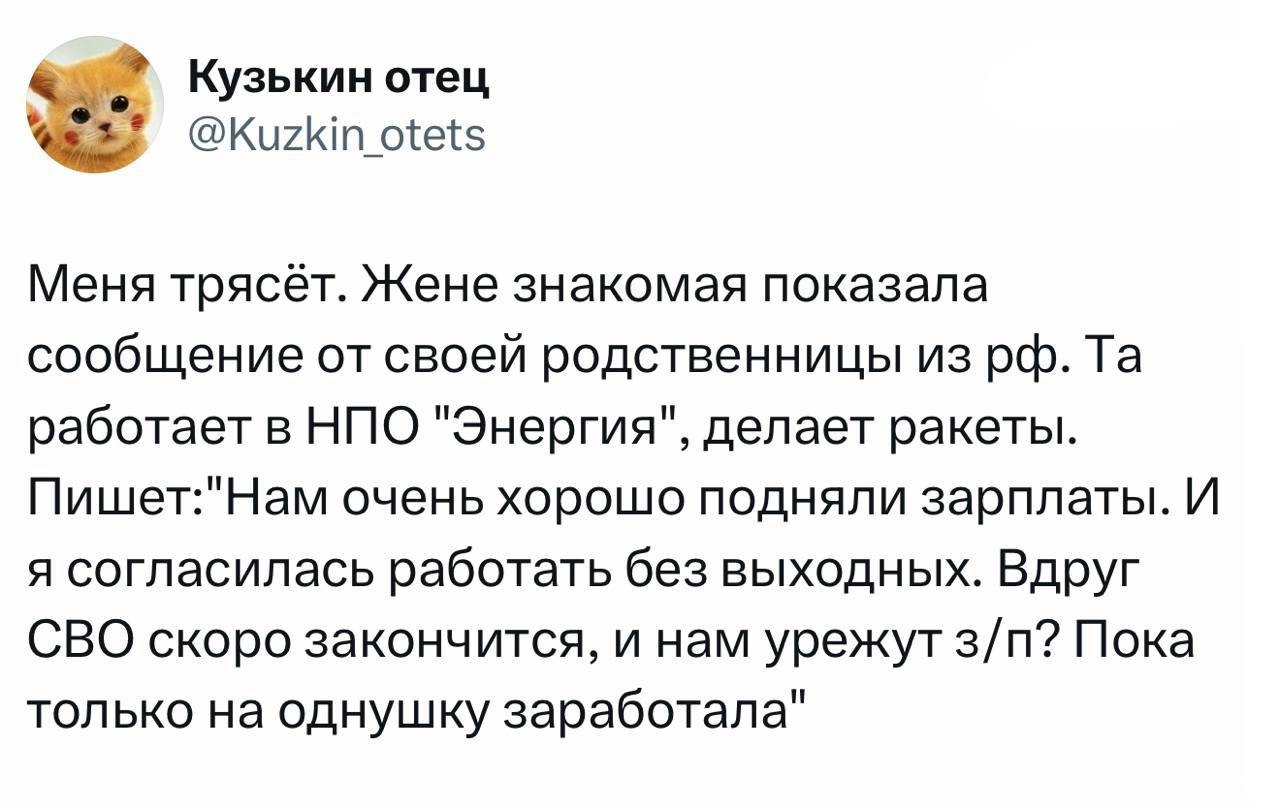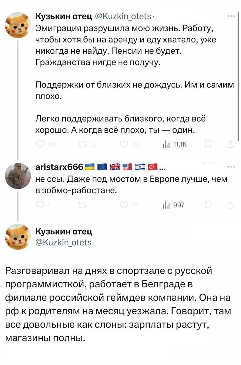 >>1267599 Объективно многие почти все сюда приехали из-за гойды. В каком-то смысле мы реально дезертиры - не пошли в окоп дроны ебалом ловить, а убежали из страны, роняя кал. Плохо это? Стыдно? Лично я так не считаю. Я сижу с двумя ногами и двумя руками в квартирке и капчую на удаленной работе, сытый и в тепле. А те, кто пошел в 2022 году гойдироваться, уже сдохли либо инвалиды колясочники. При этом какого-то особого почета и уважения к ним нет, таких людей в обществе на всех уровнях воспринимают как расходный материал и не более. Все, кто пошел на гойду, в какой-то момент наверняка пожалели об этом. И те, кто сидит в окопах сейчас, наверняка готовы отдать все, лишь бы сбежать с фронта и на самолете до Белграда съебаться при первой возможности.