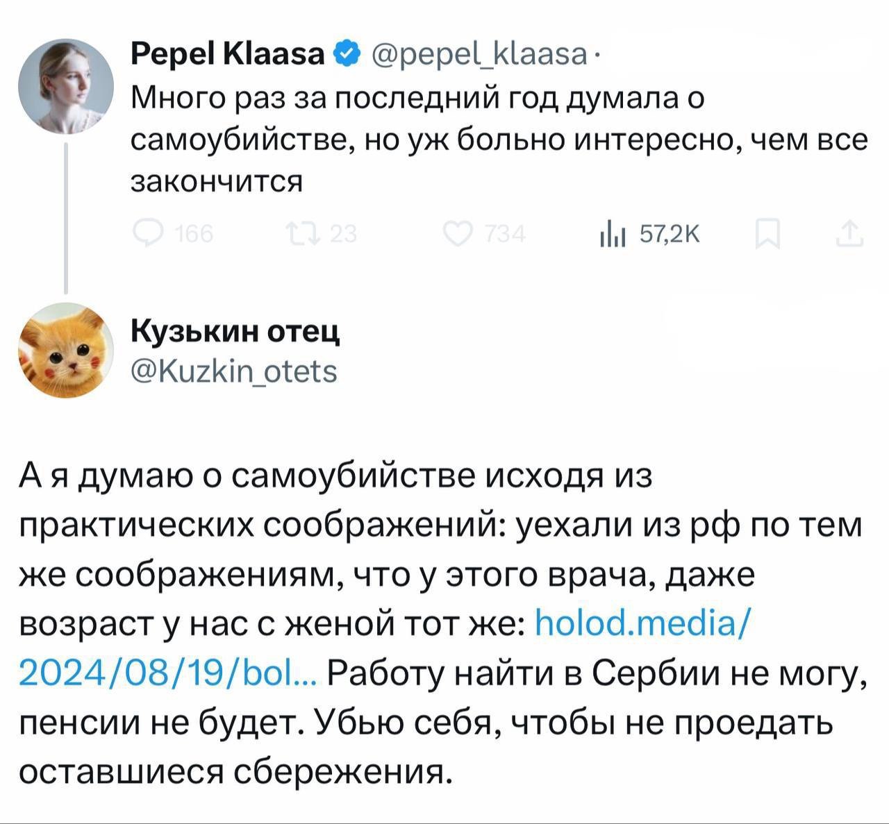 >>1273022 >так тебе и тут пизды дадут за инакомыслие Да не похоже, сербы не травмированы социалистической уравниловкой. > за свободами тебе в германию Свободы быть отгенгбенганой угольками? Или депортированной обратно в Украину гнить в окопе вместе с алкобыдлоскуфами? >>1273024 Долбоёбы как раз те, кто заморачиваются с легализацией и всирают в это кучу бабла, когда можно просто визаранить, лол. >>1273026 >800 это не про жизнь. это про выживание. Пчел, у пердиксов и так жизни нет, старшие поколения её отняли и сидят как собака на сене, в лучшем случае позволяя NEET-ствовать рядом с собой (жизнь ли это? я прошла через это, и считаю, что нет), а не выгоняя в 18 на вольные хлеба. Ни жилья, ни перспектив, ни-ху-я. Только и остаётся жопу в интернетах показывать.